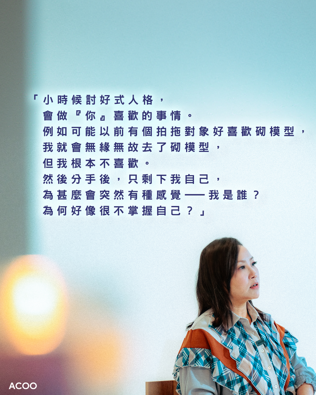 在訪問前兩日的簽唱會上,發生了這樣的一幕:Kiri T正在和歌迷們玩猜歌名遊戲,但她在台上看著題目,腦袋卻一片空白,緊張得手忙腳亂,最後竟然連自己作品的名字都忘了。事後回想,她忍不住自嘲:「明明係好簡單嘅嘢,但我好似好Kam咁⋯⋯大家話『嘩,你記性,真~係好差喎』。我都話,我可能要食啲合桃補腦⋯⋯」 如果這種尷尬與焦慮是你曾有過的共鳴,那麼她即將在澳門舉辦的演唱會《Hello Introvert》,或許就是為你而設的一個「安全出口」。在這個演唱會,她邀請各位「I」人可以放心自己一個前來,被音樂治癒:「例如我都係一個唔擅於表達自己嘅人,或者有好多嘢唔敢講。但我希望呢個演唱會可以話畀大家聽——即使我哋性格咁迴避,但我哋都值得被了解、能夠被了解。」 「我依家都會embrace自己咁Kam。」Kiri T笑說。 採訪:Heidi @heidi.is.strong 攝影:Andrew @andrew_bangchan 設計:Larry @ialyrral_ |不需要「被迫營業」的安全空間 對於很多 I 人來說,看演唱會往往伴隨著一種無形的壓力——害怕被要求站起來跳舞、害怕要表現得 High、害怕要一同高聲歌唱。「Hello Introvert」,是一個讓「I」人感到安全、舒適、自在的空間:「呢度唔會有好多機關或者娛樂,唔會叫大家要好雀躍起身。我會形容係好chill,想講嘢就講嘢,想唱歌就唱歌嘅形式。」 Kiri T這樣解讀「I」這回事:「其實I人都想要connection,只不過我哋嘅friendship要好exclusive,好gentle。我哋都鍾意好近,但可能係好近、輕輕咁講安慰你嘅說話。」這次,她希望在澳門百老匯舞台創造一個「Safe Space」,並正在探索各種適合內向者的「距離」。她又透露在歌曲選擇上希望營造一些「contrast」:「例如大家以為呢隻歌要好大力,其實可以好細力?或者以為呢隻歌好細力,其實原來可以好大力?因為對我嚟講,大家可能會誤會I人好冷漠,但可能我哋心底有好多嘢想講,只係怕打擾人哋。所以我都好想探索一下contrast呢個主題。」 |和自己的「I」來一場和解 「大概幾年前,我成日會同朋友講,如果我E啲就好啦。因為每次上台都覺得好吃力,每次訪問都會好甩咳。以前我做音樂節目,我知道見到唔識嘅人,我會預早3、4個鐘冷靜,聽meditation嘅歌,『咚~』嗰啲。」 舊作《icouldusealittlehelp》裡的一句歌詞:「Why do I pretend again and again, that I'm stronger than I am?(為何我一再假裝自己比想像中強悍?)」,正正道出她從前漫長的自我拉扯。 這幾年香港人對 MBTI 、「I」與「E」的討論多了,社會也開始對「I」多了一份理解,「某程度上時代都幫咗我。」再後來,她發現自己的聽眾都與自己面對同一種困境:「佢哋都會話喺社會好大壓力,唔夠E。反而因為我企出嚟就係咁Kam,好多歌迷會同我分享,原來我啲歌會令佢哋覺得被了解,咁我都覺得呢件事好療癒。」 早些日子派台的《我可能是迴避型》,講的正是害怕踏前一步的這種情緒。若然因為自己掙扎或卻步,而錯過一些機會甚至一些關係,不會很可惜嗎?Kiri T則這樣認為:「如果因為你I而錯過一啲關係,可能呢個都未必係你想要嘅關係。」最重要的,是認清自己想要的是甚麼。 所以,Kiri T希望這場《Hello Introvert》演唱會,不只是一場演出,更像是一次「同類」的聚會。「我覺得唔需要有壓力去invite人、約人一齊。因為你哋已經約咗我,我已經約咗你哋啦!I’ll see you there!」 Makeup: @tammyau_makeup Hair: @jamieleehair @issac_lo @hola.hair.pets In ACOO, you