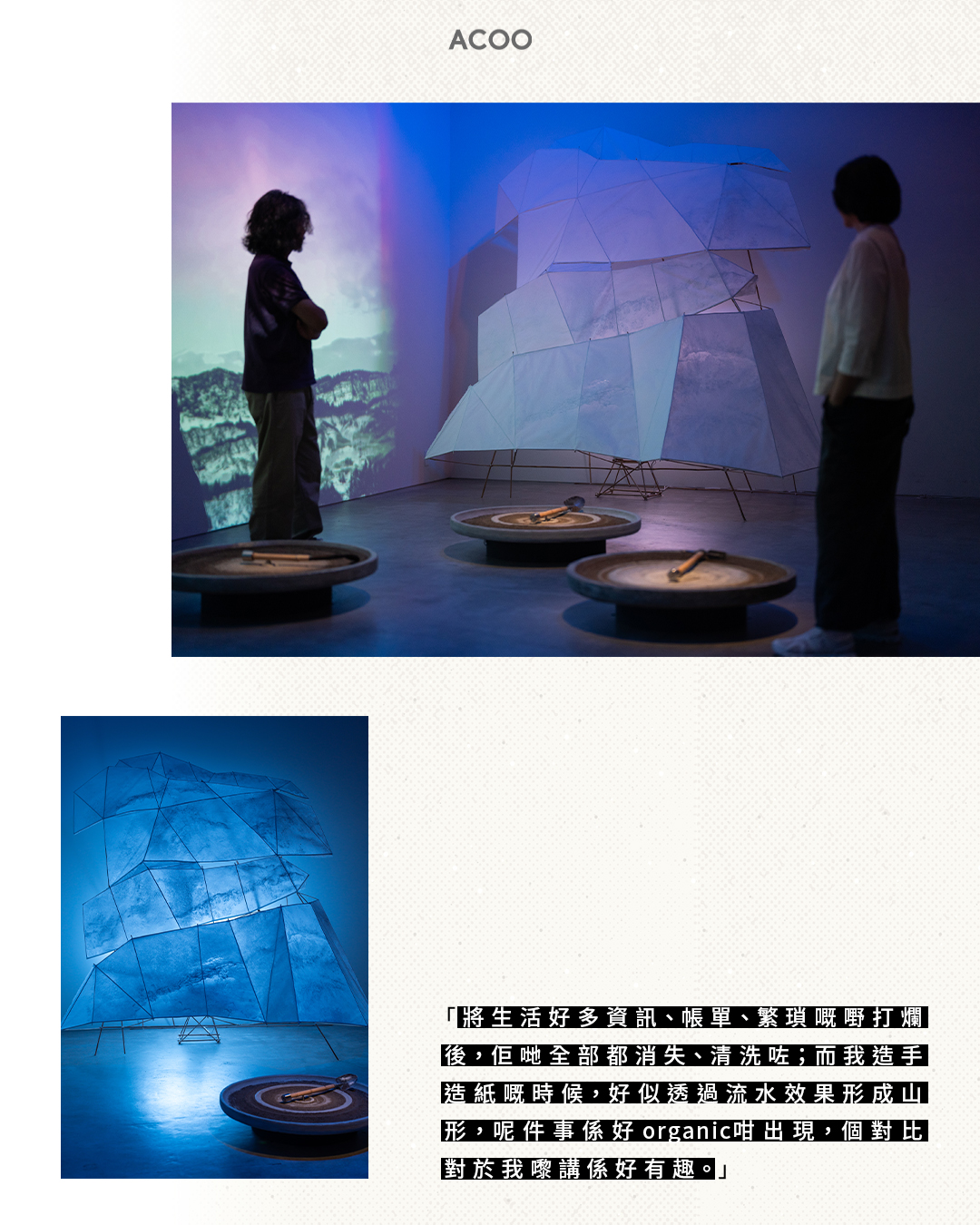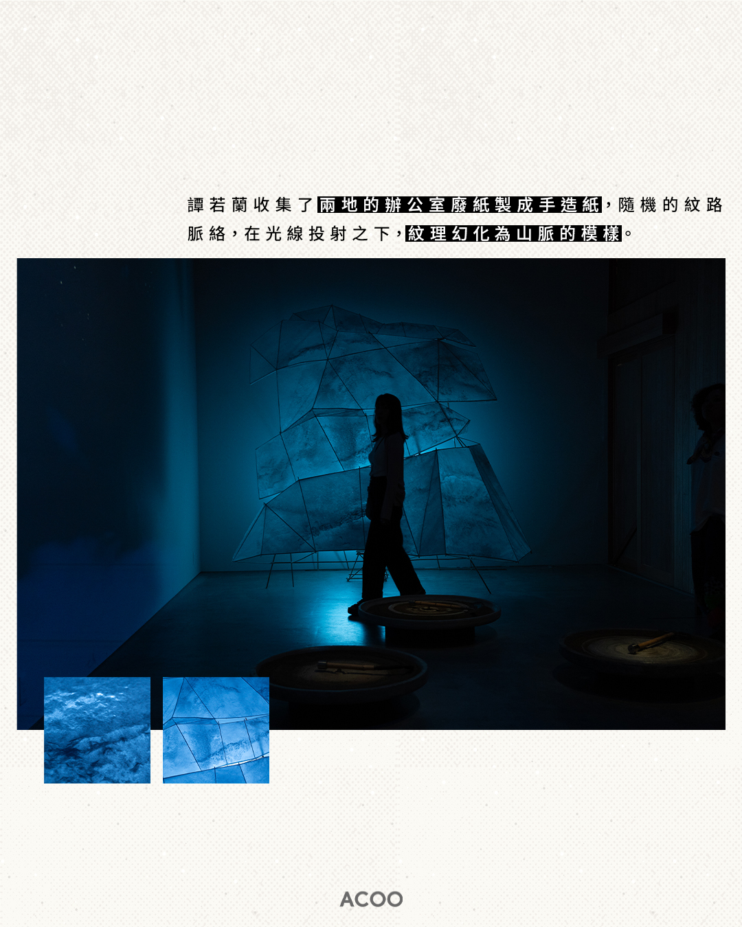 為了好好了解津南,他們在開展製作前實地考察過3次,發現山脈對於這片土地上的人,意義舉足輕重。所以,走進今年「香港部屋」的展覽,首先映入眼簾的是一個以再造紙和竹製作的山型紙塑。譚若蘭一直喜歡以再造紙為創作媒介,這次她收集了兩地的辦公室廢紙,放進攪拌機加水打碎,將紙漿倒進大水盆裡,再把大框網放進水盆裡並搖晃,使紙漿鋪滿在網上,製造出隨機的紋路脈絡。這些手造紙在光線投射之下,紋理幻化為山脈的模樣。
