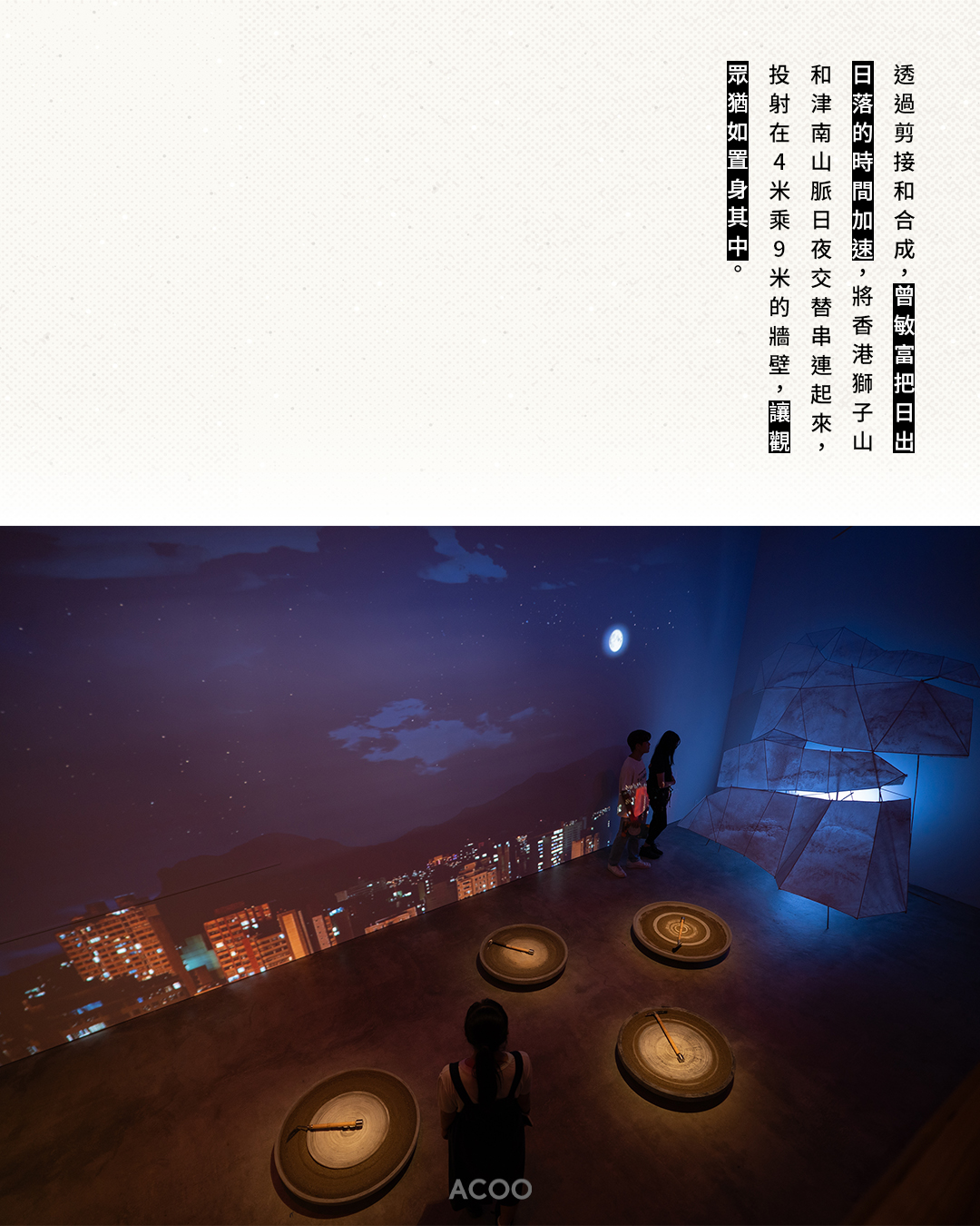 在紙塑旁邊的牆壁,則持續播放一條約8分鐘長的縮時影片。在影片中,曾敏富把日出日落的時間加速,透過剪接和合成,將香港獅子山和津南山脈日夜交替串連起來,投射在4米乘9米的牆壁,讓觀眾猶如置身其中。曾敏富說,大家可以理解這件作品為一個「唔自然嘅時間」,代表城市急速的步伐,與緩慢的農村節奏融合,帶出當中的衝突:「我哋做咗好多個layer,你見到好似係一個景,但其實唔係。我想將佢有個transfer。當你見到日出日落,係好急速嘅過程,(影片中)可以見到循環。我哋希望同城市時間做對比。」