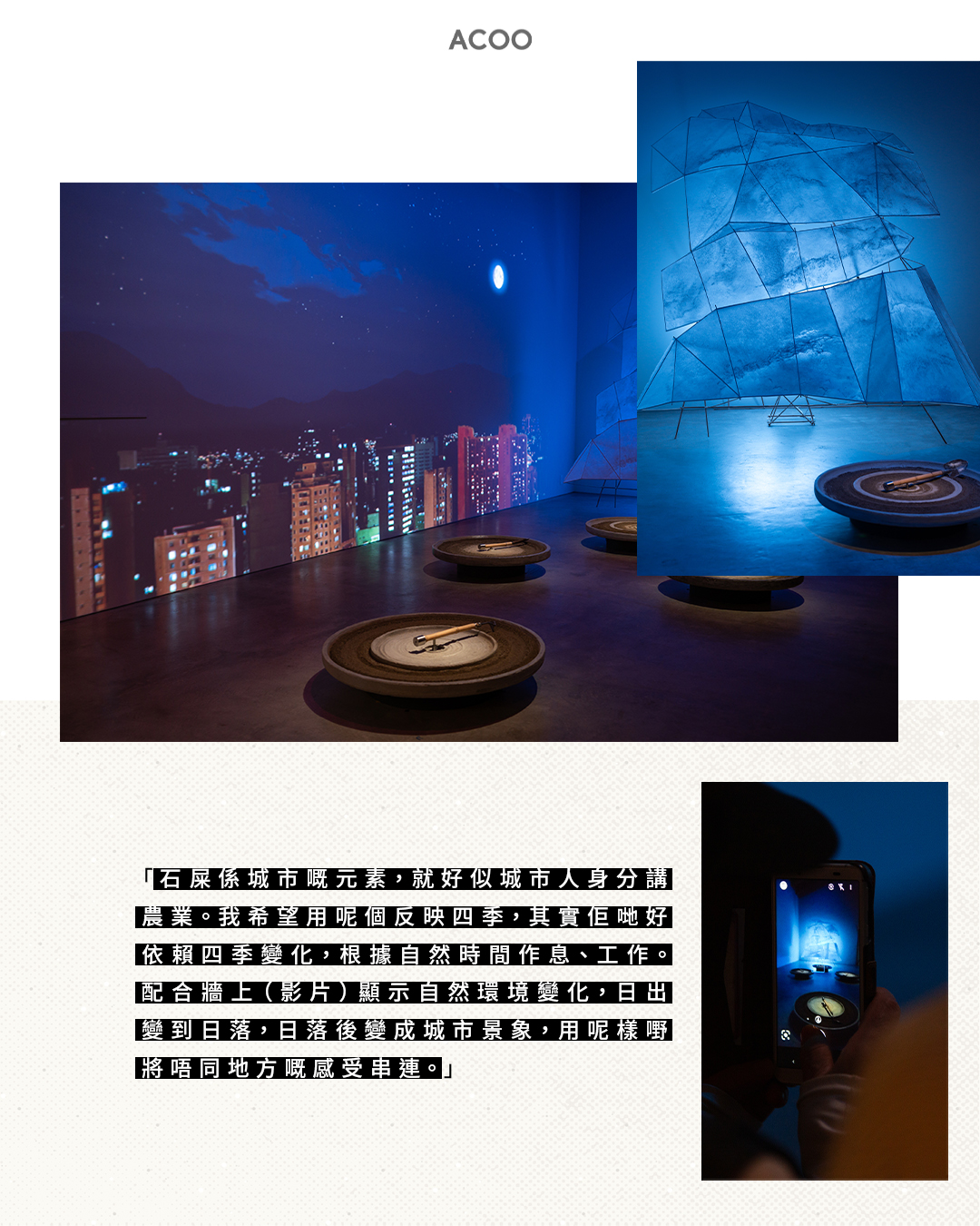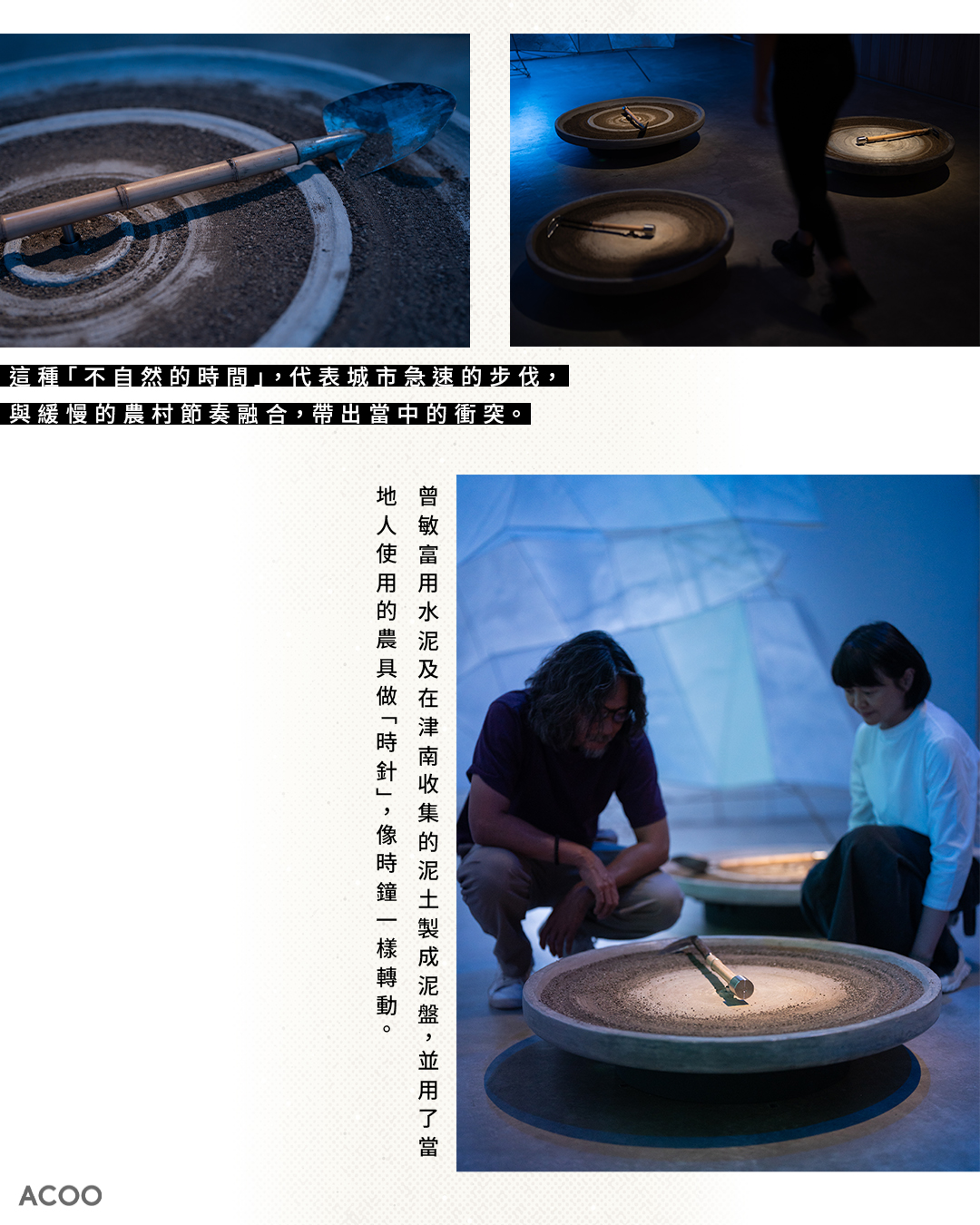 在部屋內讓觀眾感知時間的藝術品,還有4個由農具及泥盤組成的機械裝置。譚若蘭說:「呢度一到夜晚就好安靜。你會更加感受到,佢哋(當地人)會隨住四季,日出而作,日入而息。」為此,曾敏富用水泥及在津南收集的泥土製成泥盤,又將當地人使用的農具當做時針,像時鐘一樣,緩緩地轉動,「石屎係城市嘅元素,就好似以城市人身分講農業。我希望用呢個反映四季,其實佢哋好依賴四季變化,根據自然時間作息、工作。配合牆上(影片)顯示自然環境變化,日出變到日落,日落後變成城市景象,我想用呢樣嘢將唔同地方嘅感受串連。」