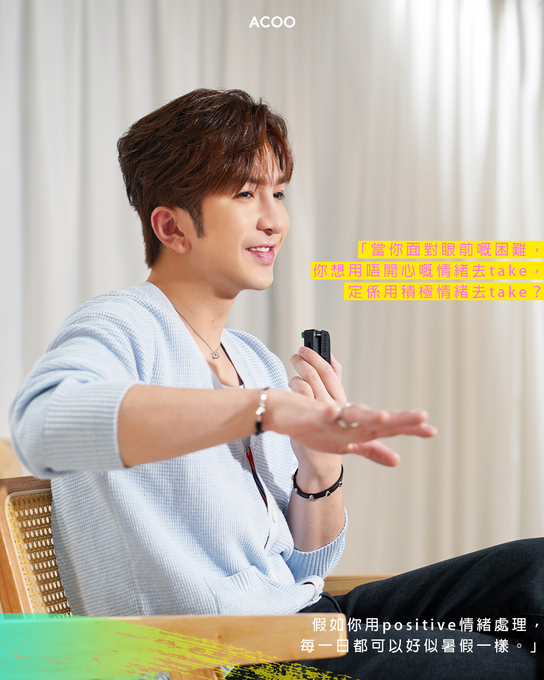 面對難關的時候,保持一顆像小孩的內心是唯一救贖,「有時候幼稚一下都無乜所謂。我覺得,你要有童真嘅心,先可以輕鬆面對所有嘢。尤其入行耐咗,好似逼住所有嘢都要好成熟處理。我都有試過去到一個位,覺得自己所有嘢變得太官腔,所有嘢都有一道牆⋯⋯有時loosen up,have fun都唔係一件壞事。」