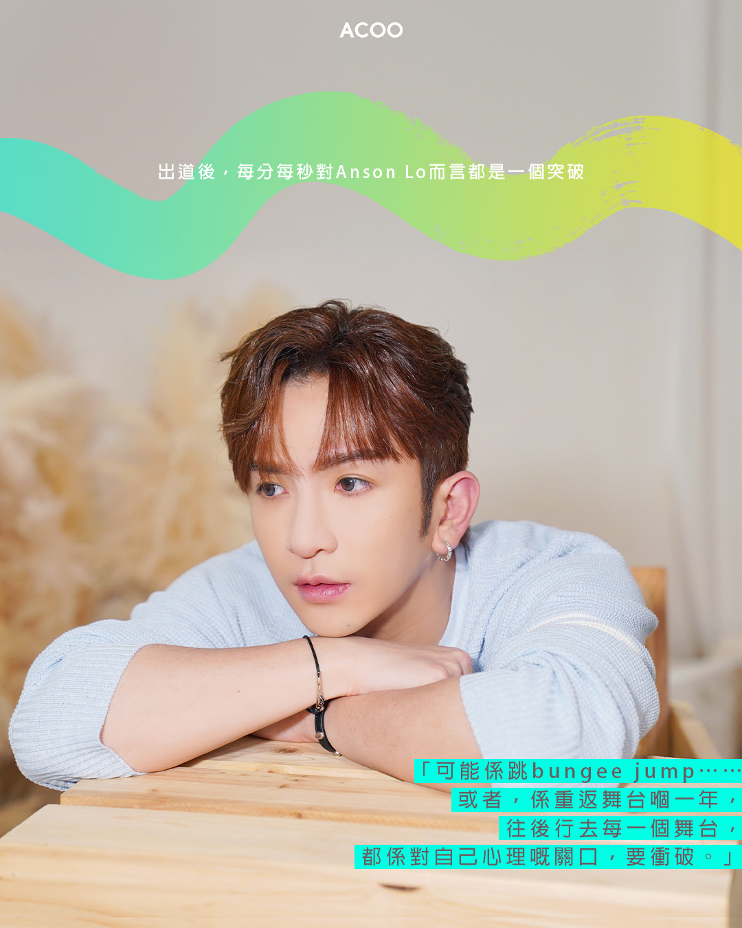 這讓他回想起小時候在父親的髮型屋剪髮,看着眼前娛樂雜誌的八卦新聞,Anson Lo自言從沒想過有一日自己會變成這些雜誌上的其中一個人,「有一格有自己嘅樣,已經係呢世人都無諗過嘅嘢」。而在出道後的這些日子,每分每秒對Anson Lo而言都是一個突破,「可能係跳bungee jump⋯⋯或者,係重返舞台嗰一年,往後行去每一個舞台,都係對自己心理嘅關口,要衝破。」