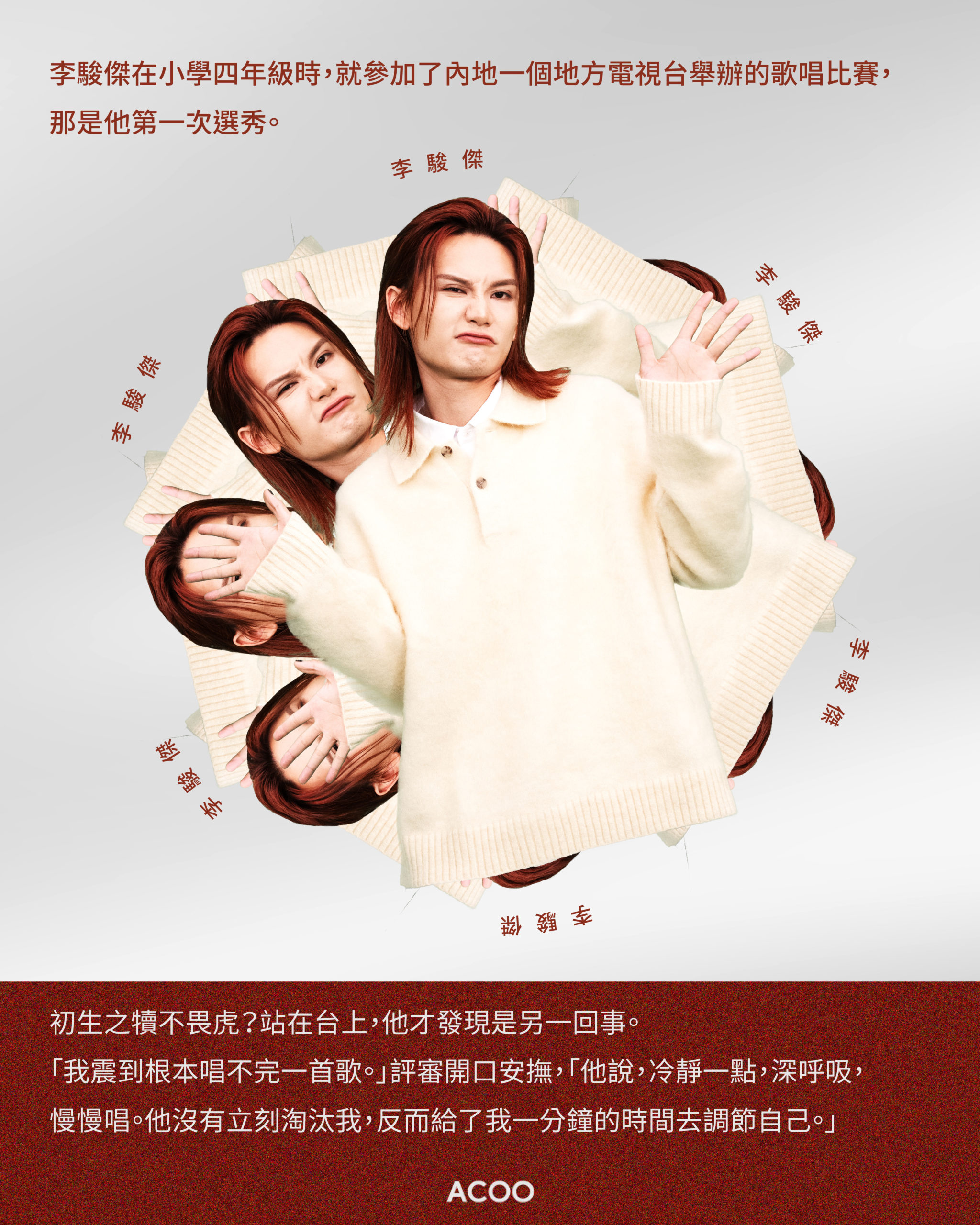 李駿傑才小學四年級,就參加了內地一個地方電視台舉辦的歌唱比賽,那是他第一次選秀。初生之犢不畏虎?站在台上,他才發現是另一回事。「我震到根本唱不完一首歌。」評審開口安撫,「他說,冷靜一點,深呼吸,慢慢唱。他沒有立刻淘汰我,反而給了我一分鐘去調節自己。」