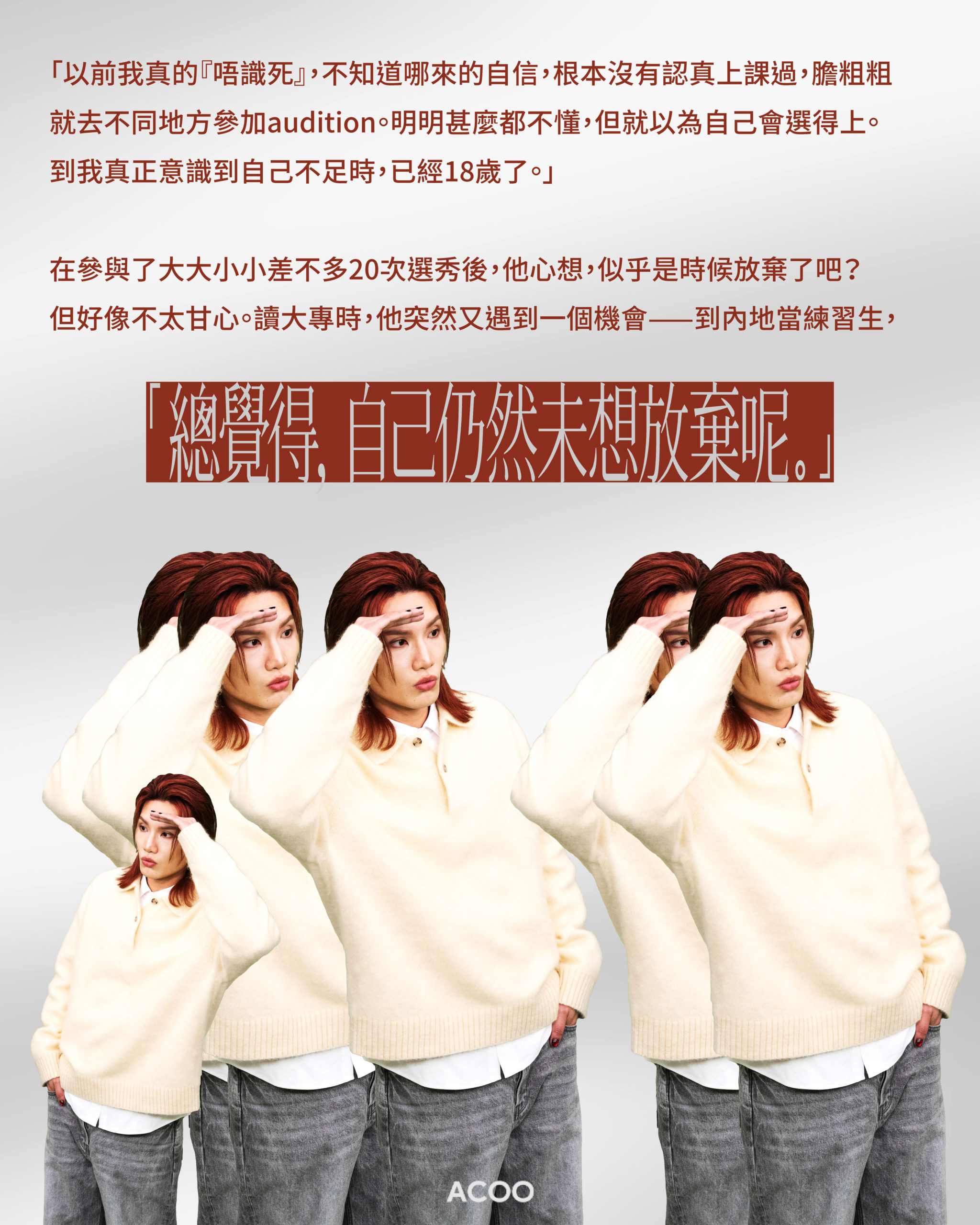 「以前我真的『唔識死』,不知道哪來的自信,根本沒有認真上課過,膽粗粗就去不同地方參加audition。甚麼都不懂,就以為自己會選得上。到我真正意識到自己的不足時,已經18歲了。」在參與了大大小小差不多20次選秀後,他心想,似乎是時候放棄了吧?但好像不太甘心。讀大專時,他突然又遇到一個機會——到內地當練習生,「總覺得,自己好似仍然未想放棄呢。」
