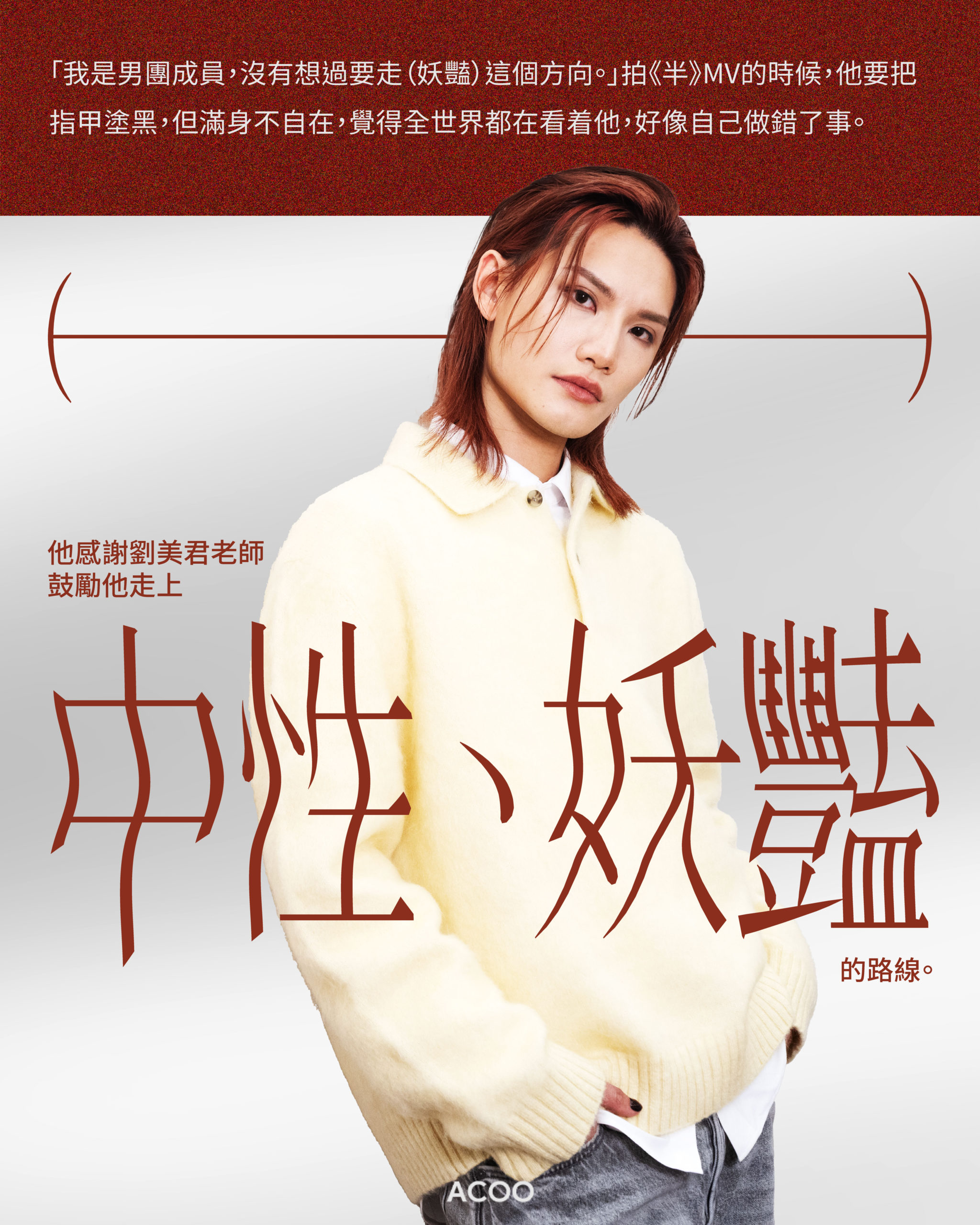 當他第一次聽到這個提議,第一個反應是自我懷疑:「我是男團成員,走出來其實好強勁,我沒有想過要走(妖豔)這個方向。」思想卻還沒跟上,身體已經被推着向前。拍《半》的MV時候,他要塗黑指甲,坐在化妝椅時覺得全世界都在看着他,好像自己做錯了事一樣。