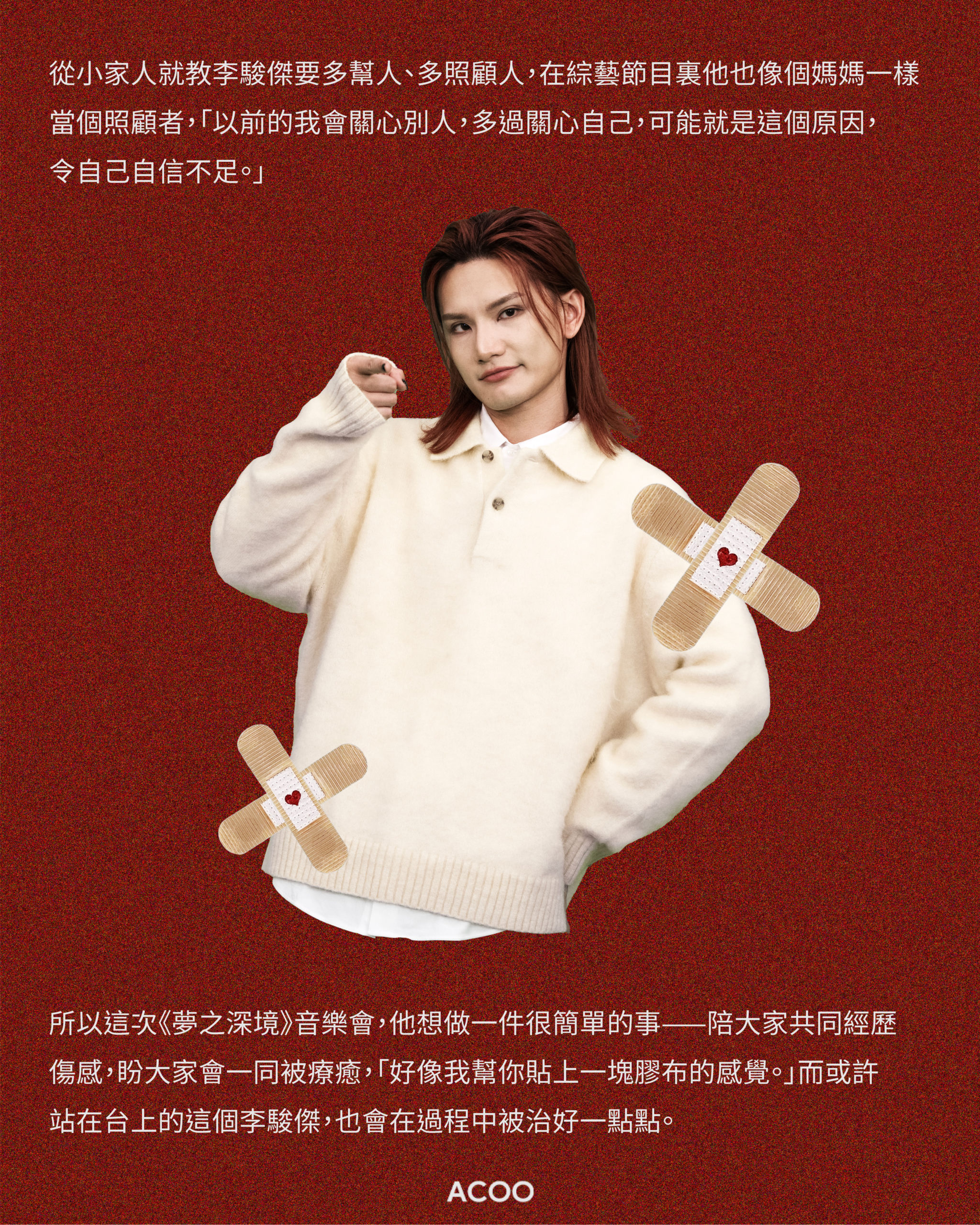 從小家人就教李駿傑要多幫人、多照顧人,在綜藝節目裏,他也像個媽媽一樣當個照顧者,「以前的我會關心別人,多過關心自己,可能就是這個原因,令自己自信不足。」所以這次的音樂會,他想做一件很簡單的事——陪大家共同經歷傷感,盼大家會一同被療癒,「好像我幫你黏了一塊膠布的感覺。」