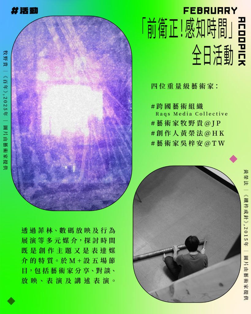 以「時間」為題,探索當代流動影像創作。四位重量級藝術家:日本藝術家牧野貴、跨國藝術組織Raqs Media Collective、香港創作人黃榮法及台灣藝術家吳梓安,透過菲林、數碼放映及行為展演等多元媒介,探討時間既是創作主題又是表達媒介的特質。
