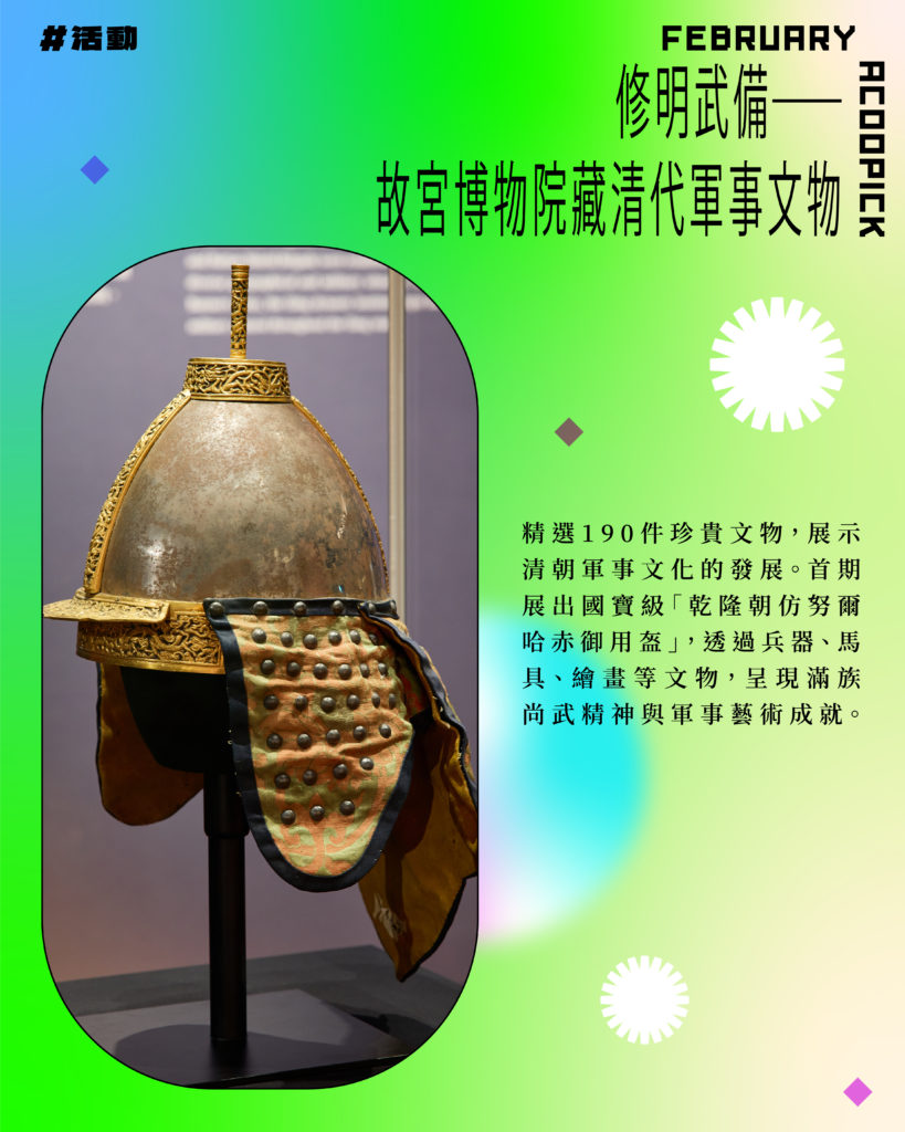 「香港賽馬會呈獻系列:修明武備──故宮博物院藏清代軍事文物」展覽凸顯滿族尚武精神,展出約190件珍貴文物,包括首期(即日至4月21日)限定展出的國寶「乾隆朝仿努爾哈赤御用盔」。展品涵蓋盔甲、弓箭、刀劍、馬具、繪畫等,全方位呈現清代軍事文化的輝煌成就。
