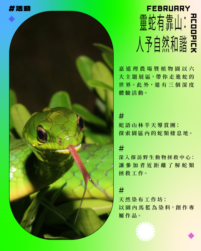 嘉道理農場暨植物園以六大主題展區,帶你走進蛇的世界。展覽設有巨型蛇棋、爬行動物觀賞台的盲摸箱和「蛇影尋踪」等互動展品,透過遊戲消除大眾對蛇的誤解。園區設「靈蛇郵記」集章活動及「百家蛇布」藝術裝置。