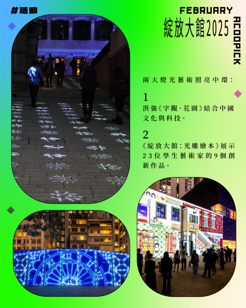 年度盛事以兩大燈光藝術照亮中環夜空:《字觀.花園》由本地新媒體藝術家洪強創作,在檢閱廣場將中國文化與現代科技完美融合;《綻放大館:光雕繪本》則展示23位學生藝術家,在 The Electric Canvas 及本地多媒體藝術家吳子昆專業指導下,創作的九個作品投影在監獄操場的歷史建築上,展現新一代創作者的無限可能。