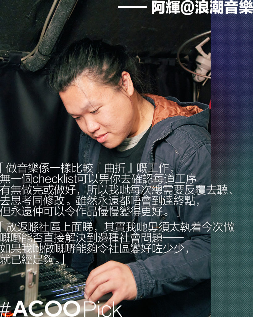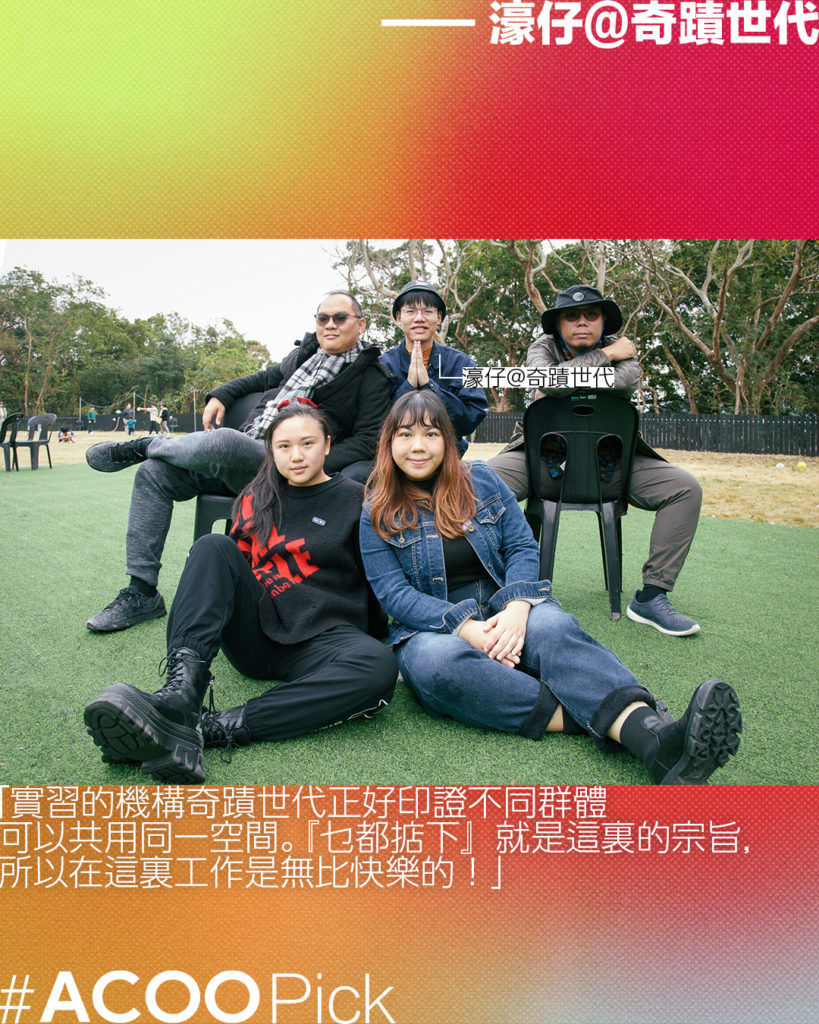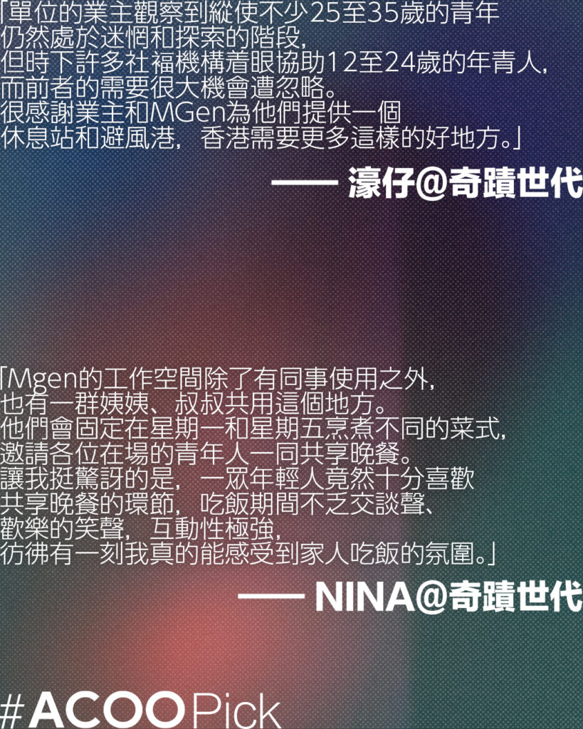 濠仔和Nina在奇蹟世代 @mgen.555 一邊吃着「大鑊飯」,一邊發現了空間使用的多元性;Plato在一坪半性別空間 @onebookhalf_genderspace 踏出同溫層,學會了擺脫「小眾」標籤;Vickie作為觀塘居民,在Kadey Jadey @kadeyjadey探索和創作、發現觀塘不只等於「交通擁擠」;阿輝在浪潮音樂 @wavemusicstudiohk,明白到:「如果我哋做嘅嘢能夠令社區變好咗少少,就已經足夠。」