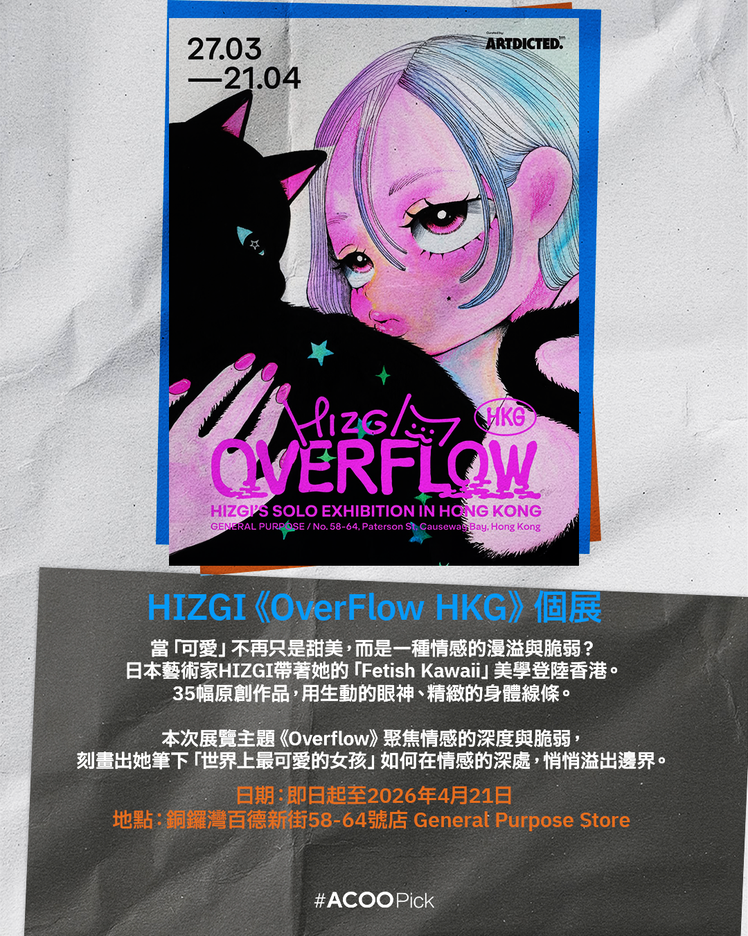 當「可愛」不再只是甜美,而是一種情感的漫溢與脆弱?日本藝術家HIZGI帶著她的「Fetish Kawaii」美學登陸香港。35幅原創作品,用生動的眼神、精緻的身體線條。本次展覽主題《Overflow》聚焦情感的深度與脆弱,刻畫出她筆下「世界上最可愛的女孩」如何在情感的深處,悄悄溢出邊界。