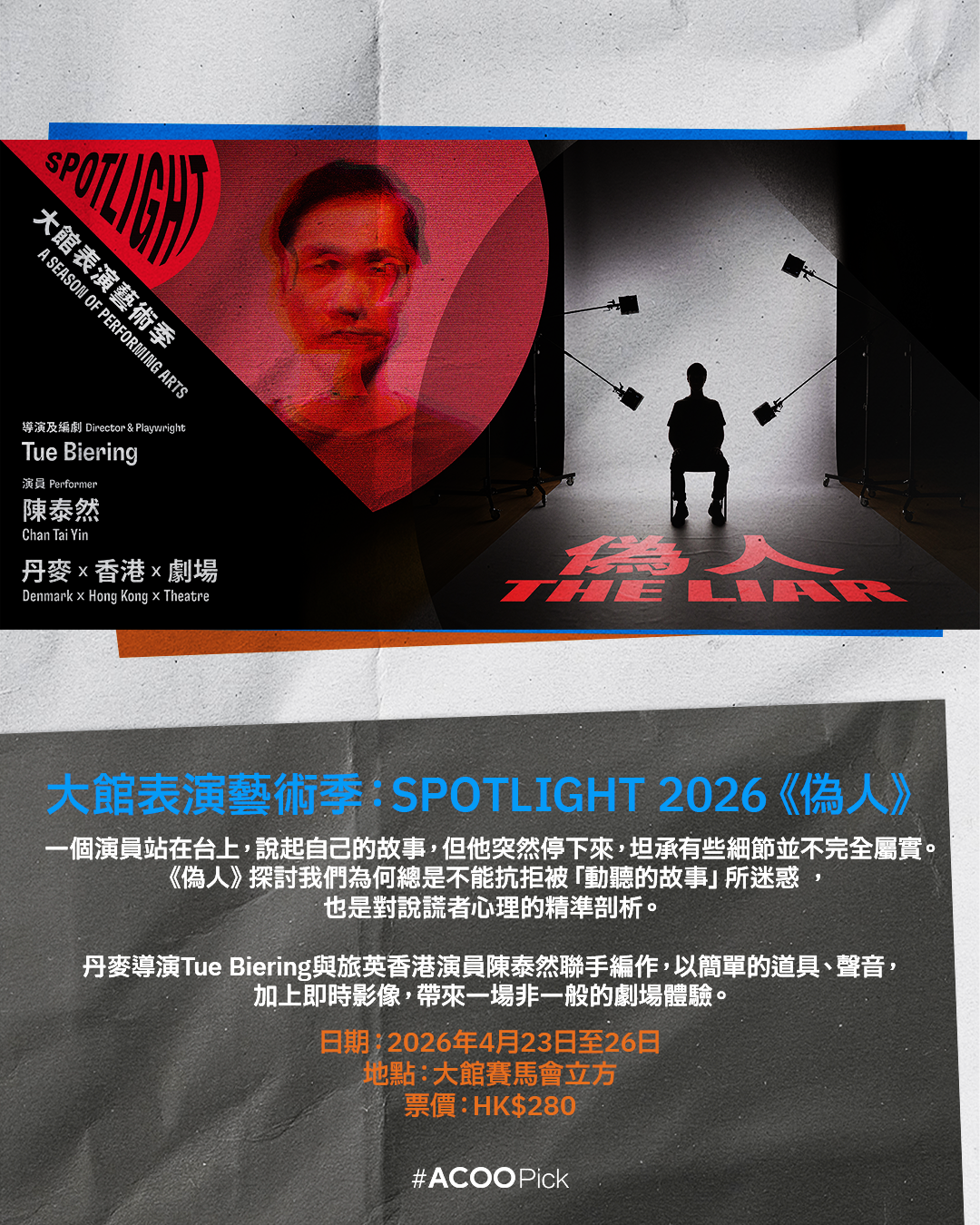 雖然ART March經已落幕,但這座城市的文化節奏從未真正停下來。展覽仍在延續、劇場的燈光依然亮著,藝術家的創作能量還在發酵。意猶未盡的話,ACOO為你精選四月不可錯過的文化活動,讓這份餘韻再走遠一點。