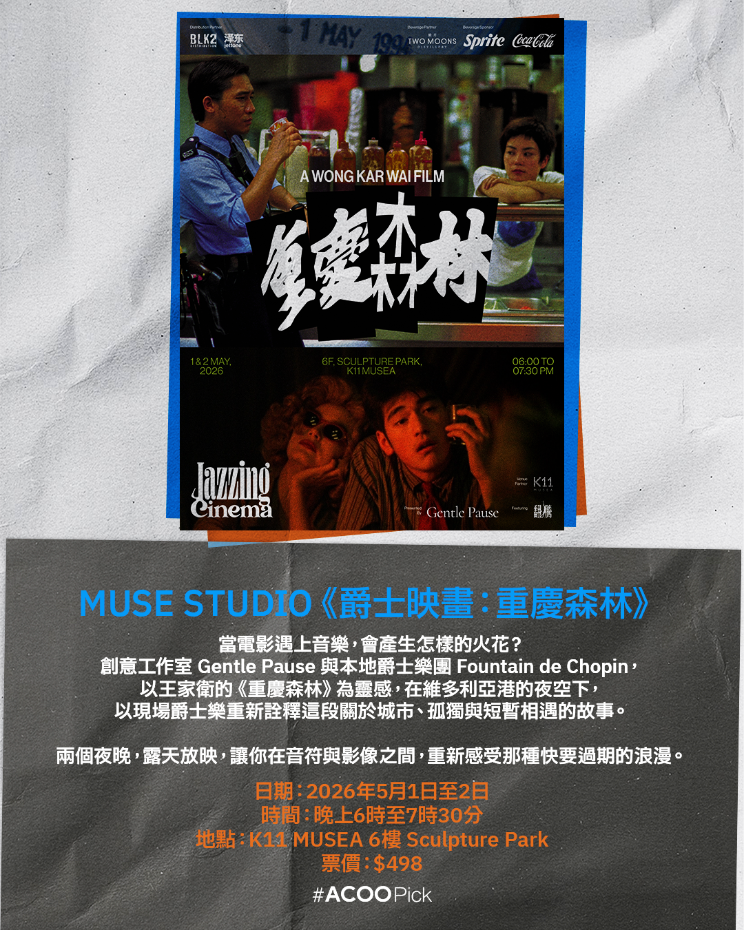 當電影遇上音樂,會產生怎樣的火花?創意工作室 Gentle Pause 與本地爵士樂團 Fountain de Chopin,以王家衛的《重慶森林》為靈感,在維多利亞港的夜空下,以現場爵士樂重新詮釋這段關於城市、孤獨與短暫相遇的故事。兩個夜晚,露天放映,讓你在音符與影像之間,重新感受那種快要過期的浪漫。