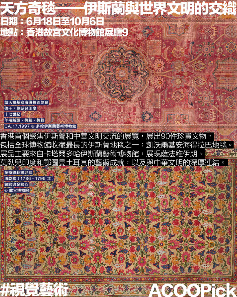 香港首次舉辦聚焦伊斯蘭文明的大型展覽,展出90件來自卡塔爾多哈伊斯蘭藝術博物館的珍貴文物。展品包括舉世聞名的凱沃爾基安海得拉巴地毯——這幅長達16米的地毯是現存博物館收藏中最長的伊斯蘭地毯之一。展覽更展出多件來自薩法維伊朗、莫臥兒印度和鄂圖曼土耳其三大伊斯蘭王朝的藝術珍品,包括地毯、瓷器、金屬工藝品、彩繪手稿及玉器等,呈現伊斯蘭藝術與中華文明的深厚交流。