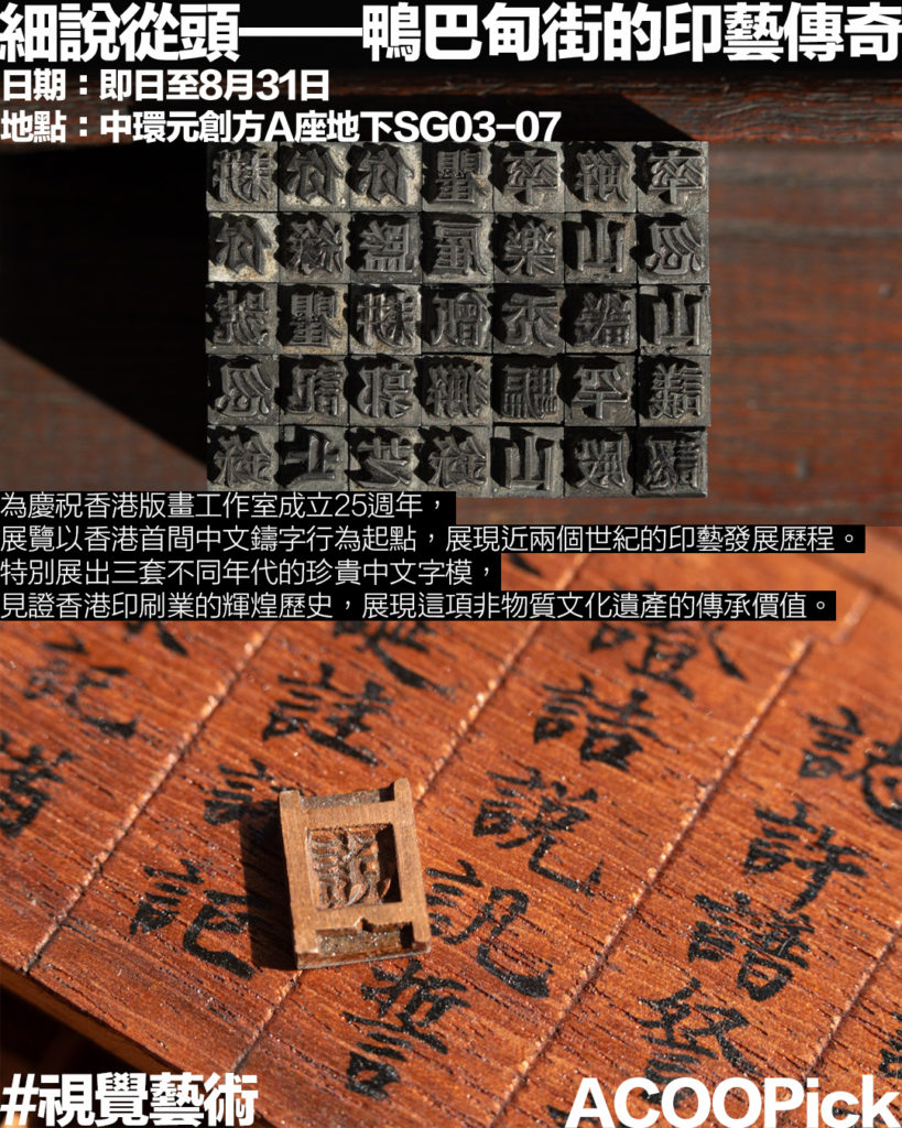 適逢香港版畫工作室25週年銀禧誌慶,這個展覽以香港首間中文鑄字行——英華書院為起點,展現近兩個世紀的印藝發展。展覽特別展出三套來自不同年代的珍貴中文字模:1881年購自中環歌賦街的香港中華印務總局,來自牛津大學出版社檔案館的字模、1950年代古巴夏灣拿《光華報》字模,以及1980年代永成鑄字行的字模,見證香港印刷業如何連接中西文化,推動華文出版發展。