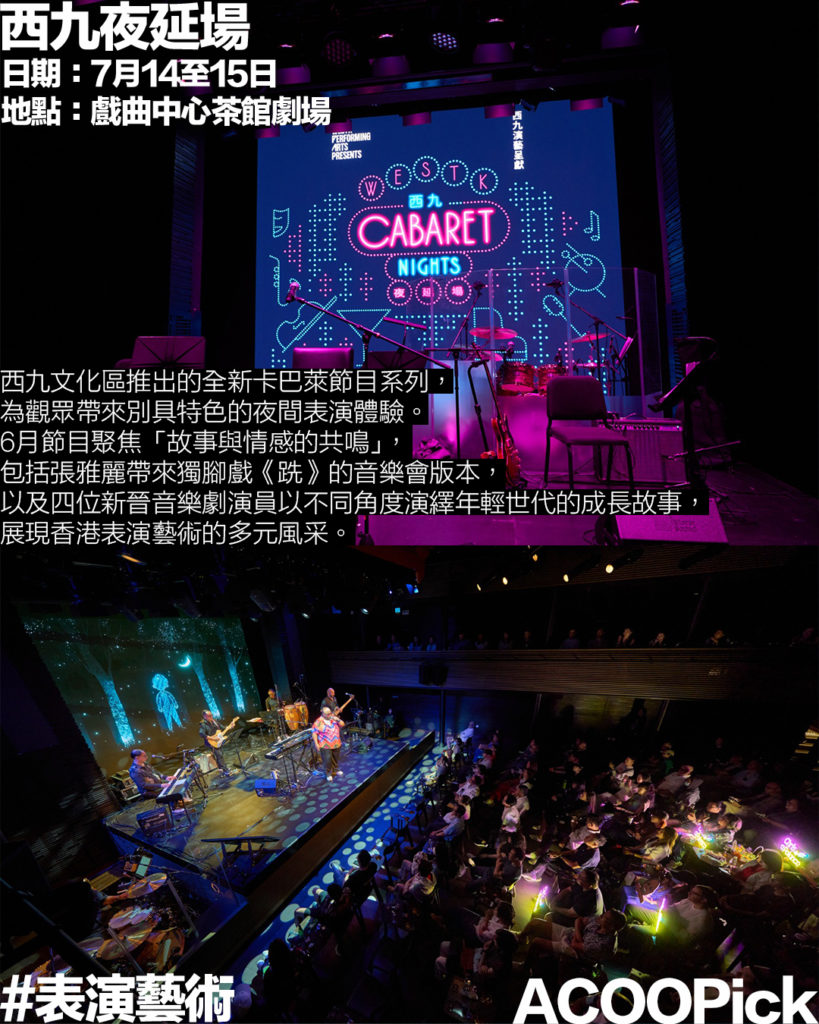 西九文化區推出的全新卡巴萊節目系列,為觀眾帶來別具特色的夜間表演體驗。6月節目聚焦「故事與情感的共鳴」,包括張雅麗帶來獨腳戲《跣》的音樂會版本,以及四位新晉音樂劇演員以不同角度演繹年輕世代的成長故事,展現香港表演藝術的多元風采。