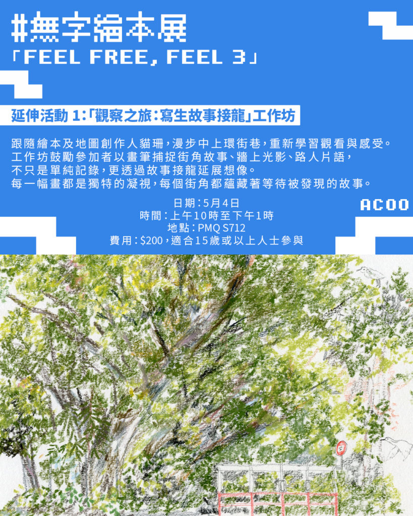 為讓觀眾更深入體會無字繪本的創作魅力,展期間特別策劃五場別具特色的工作坊及分享會,從創作者分享到實踐工作坊,從寫生探索到跨媒介表演,邀請大家一同走進繪本創作的多元世界。