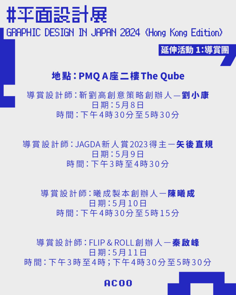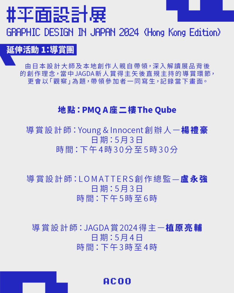 展覽期間特別策劃多場導賞團、設計講座及親子工作坊,邀請本地與日本設計大師親身帶領觀眾探索設計世界。