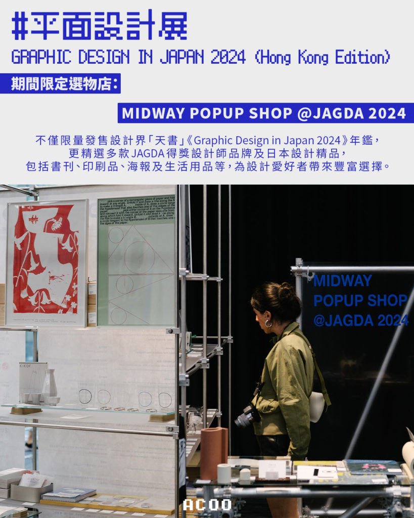 此外,展覽更首度增設期間限定選物店「MIDWAY POPUP SHOP @JAGDA 2024」,特別精選多款JAGDA 2024得獎設計師品牌與日本設計選物,從設計界「天書」《Graphic Design in Japan 2024》年鑑到書刊、海報、生活用品等,為設計愛好者帶來豐富選擇。