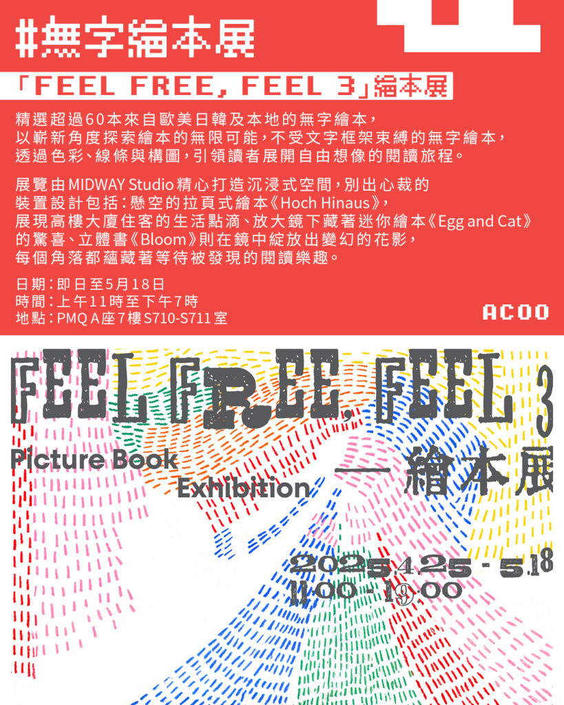 精選超過60本來自歐美日韓及本地的無字繪本,以嶄新角度探索繪本的無限可能,不受文字框架束縛的無字繪本,透過色彩、線條與構圖,引領讀者展開自由想像的閱讀旅程。展覽由MIDWAY Studio精心打造沉浸式空間,別出心裁的裝置設計包括:懸空的拉頁式繪本《Hoch Hinaus》,展現高樓大廈住客的生活點滴、放大鏡下藏著迷你繪本《Egg and Cat》的驚喜、立體書《Bloom》則在鏡中綻放出變幻的花影,每個角落都蘊藏著等待被發現的閱讀樂趣。
