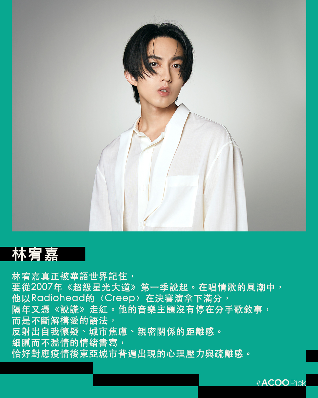 林宥嘉真正被華語世界記住,要從2007年《超級星光大道》第一季說起。在唱情歌的風潮中,他以Radiohead的〈Creep〉在決賽演拿下滿分,隔年又憑《說謊》走紅。他的音樂主題沒有停在分手歌敘事,而是不斷解構愛的語法,反射出自我懷疑、城市焦慮、親密關係的距離感。細膩而不濫情的情緒書寫,恰好對應疫情後東亞城市普遍出現的心理壓力與疏離感。