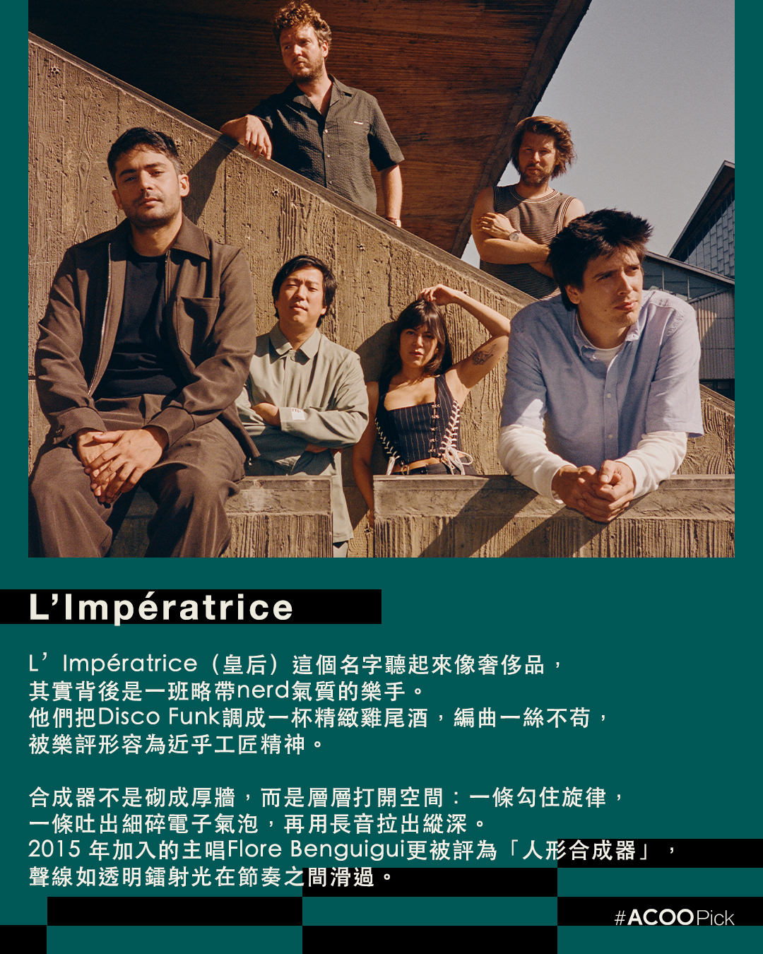 L’Impératrice(皇后)這個名字聽起來像奢侈品,其實背後是一班略帶nerd氣質的樂手。他們把Disco Funk調成一杯精緻雞尾酒,編曲一絲不苟,被樂評形容為近乎工匠精神。