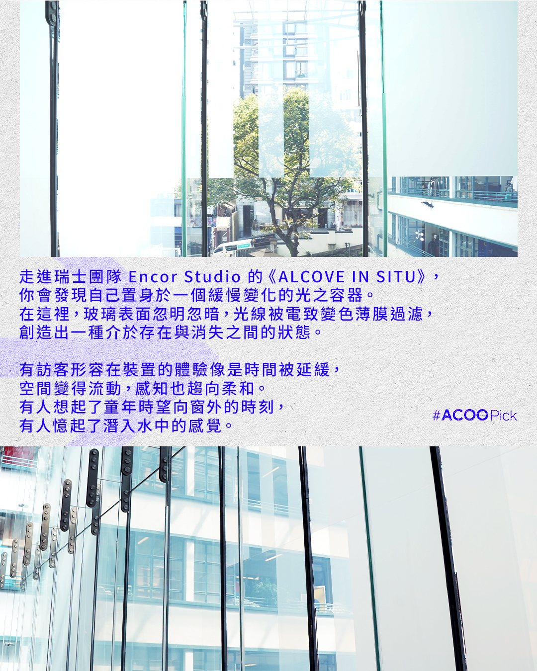 走進瑞士團隊 Encor Studio 的《ALCOVE IN SITU》,你會發現自己置身於一個緩慢變化的光之容器。在這裡,玻璃表面忽明忽暗,光線被電致變色薄膜(electrochromic film)過濾,創造出一種介於存在與消失之間的狀態。