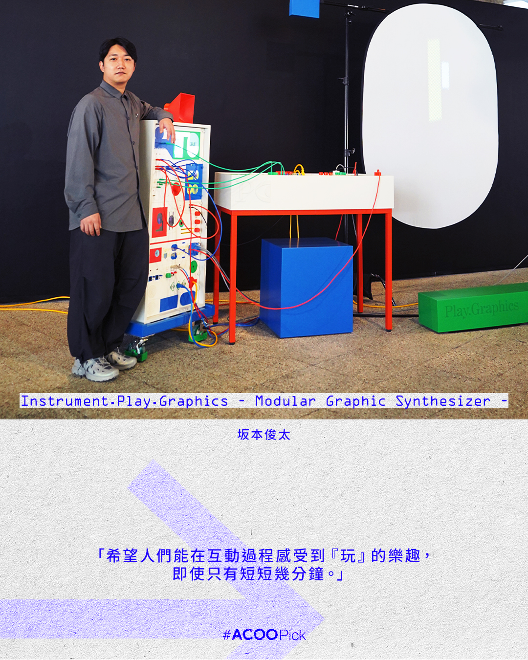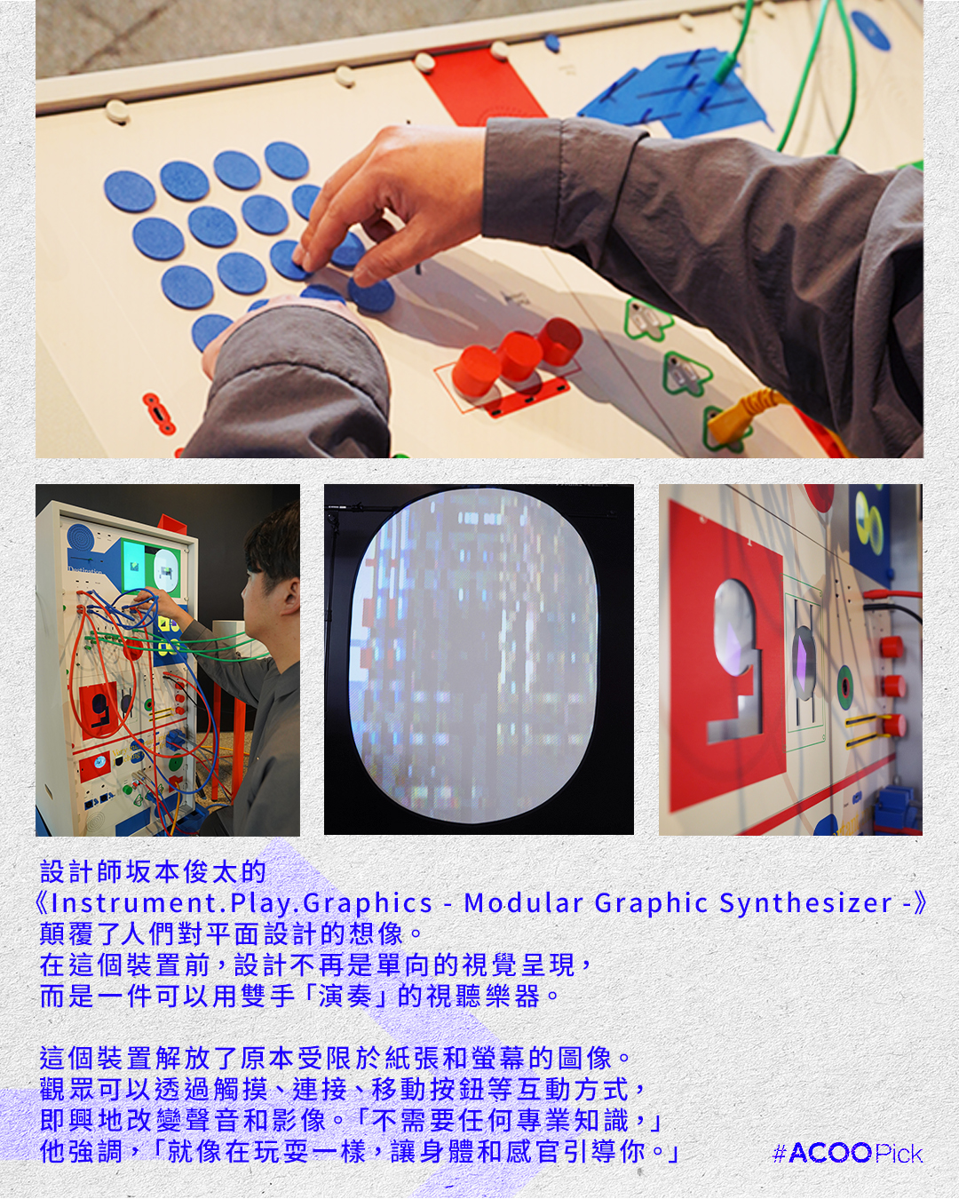 設計師坂本俊太的《Instrument.Play.Graphics – Modular Graphic Synthesizer -》顛覆了人們對平面設計的想像。在這個裝置前,設計不再是單向的視覺呈現,而是一件可以用雙手「演奏」的視聽樂器。觀眾可以透過觸摸、連接、移動按鈕等互動方式,即興地改變聲音和螢幕上影像。「不需要任何專業知識,」他強調,「就像在玩耍一樣,讓身體和感官引導你。」