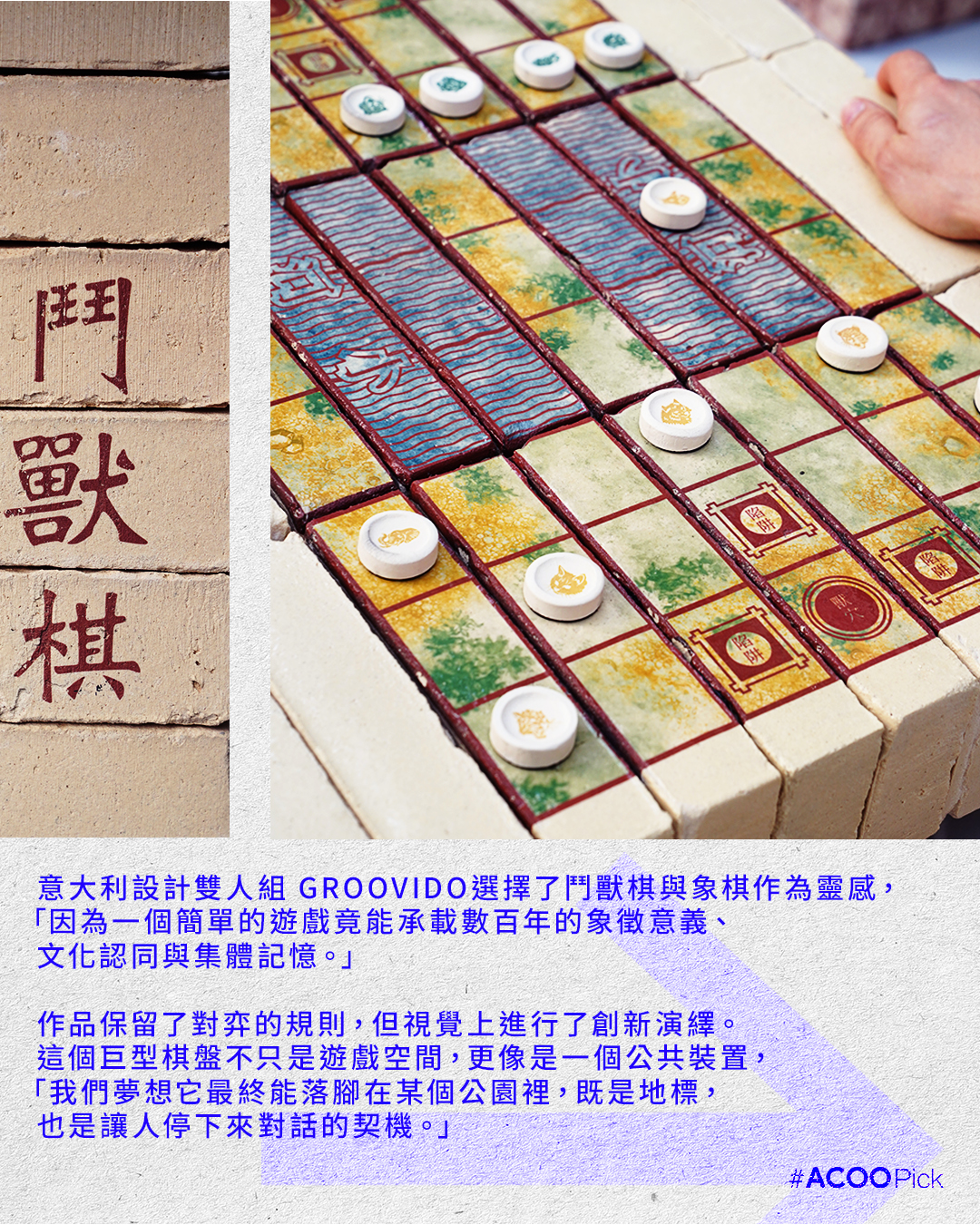 「建材產業正面臨深刻轉型,新型材料正在取代傳統磚塊。」二人解釋,「我們實驗了一種能將數位影像印刷於磚面的新技術,希望為這項創新技術找到合適的應用場景。」他們選擇了鬥獸棋與象棋作為靈感,「因為一個簡單的遊戲竟能承載數百年,並成為文化認同與集體記憶。」