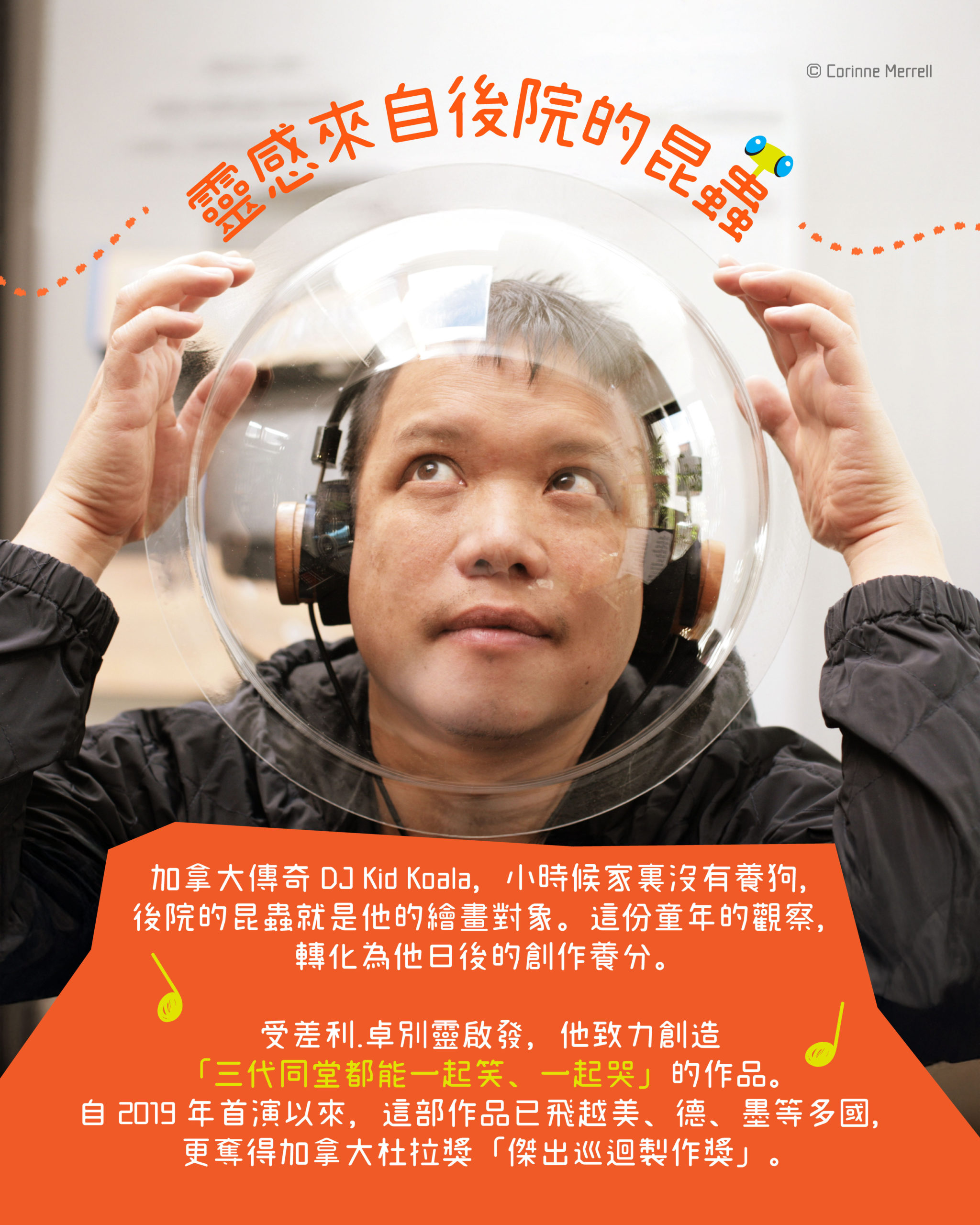這部充滿奇想的作品,出自加拿大知名多棲藝術家無尾熊小子(DJ Kid Koala)之手。Kid Koala 曾分享,小時候家裏沒有養狗,後院的昆蟲就是他的繪畫對象。這份童年的觀察,轉化為他日後的創作養分。另外,他也在創作自述中説,自己童年最美好的回憶之一,就是與父母和祖父母一起去看差利.卓別靈的電影。「那是我記憶中為數不多的珍貴時刻,我們三代同堂坐在一起,一起笑著、一起流淚,被同一部藝術作品所感動。自此之後,創造可以用歡樂連繫人心的作品就成為了我的人生目標。」