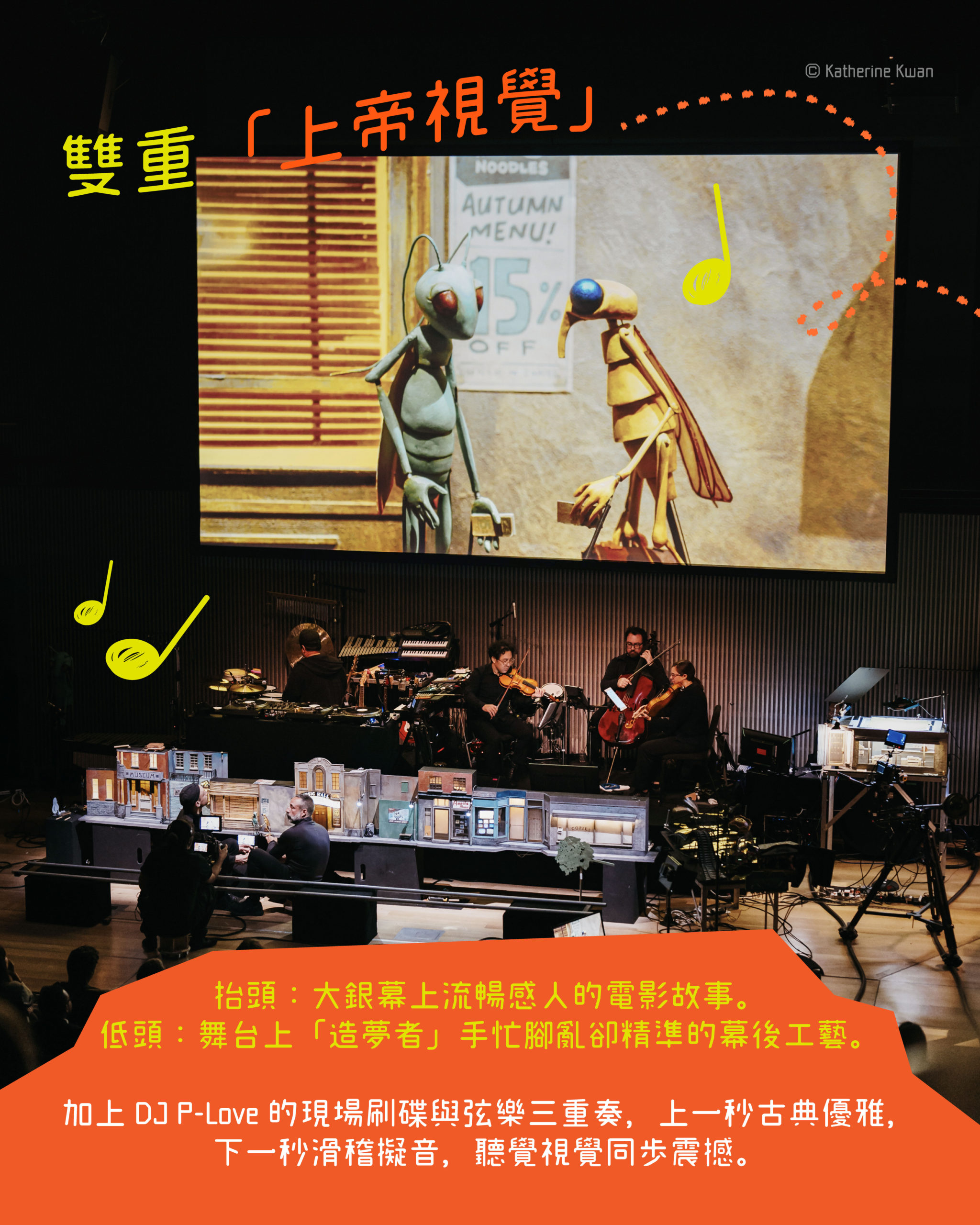 在這個特效盛行的年代,這場演出選擇了一條最難行的路。因為舞台上,14 位來自不同領域的職人——戲偶師、擬音師、攝影師、音樂人,如同精密的鐘錶零件般穿梭於20座微縮模型場景之間,並同步操控著 75 隻大小不一的手工戲偶,透過8部攝影機進行高難度的「一鏡到底」拍攝。與此同時,唱片騎師 P-Love 運用唱盤與電子樂器,搭配弦樂三重奏,即時為劇情鋪墊情緒。上一秒是優雅的古典樂韻,下一秒隨著蚊子的滑稽動作,一切聲音畫面都在現場精準切入。