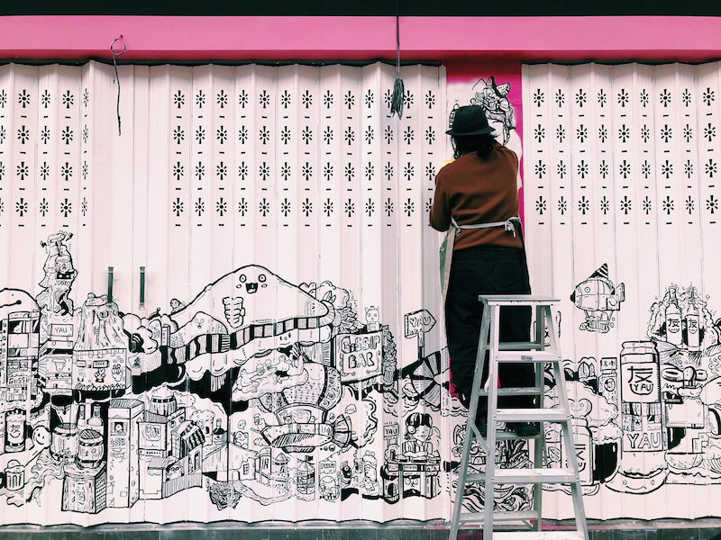 有人說,藝術家都是孤獨的。不過,JasonTommy卻是一個例外,他開玩笑道:「我好怕要自己孭飛(承擔責任)。」第一次接到畫酒吧閘的邀請,也是他至今最滿意的作品,當時他向客戶提議多找幾位藝術家一起「Jam」:「一個人做好孤獨,畫得多漂亮也好,和別人分享也是純粹自己的作品。」有些人追求個人的成功,而Jason Tommy則更享受創作時彼此交流的樂趣,正如在訪問當天他為一間本港知名人才顧問公司KOS會議室塗鴉,作品以充滿樂趣的求職過程作為主題,而JasonTommy亦有帶同朋友Billy(IG@artlab852)為畫作噴色。
