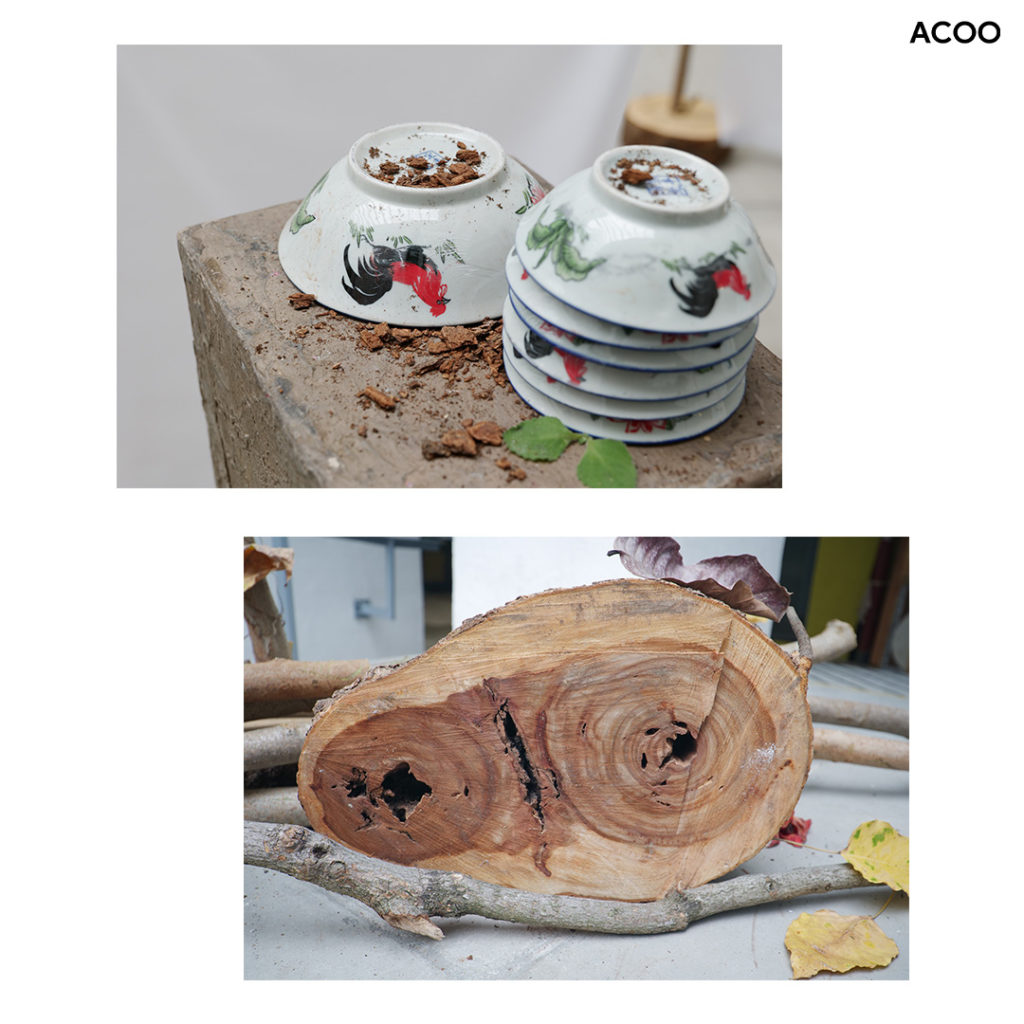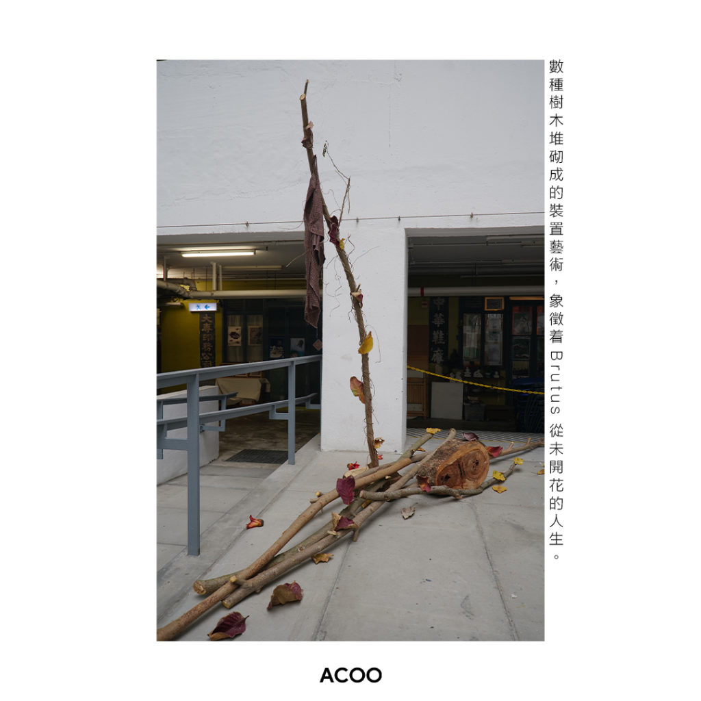 「同一班園藝朋友,剛巧地政署有一個project要清除這棵樹,因為它阻礙了興建別的東西。」Brutus走到「美」的右方,地上有一塊樟木年輪、銀合歡樹枝架成的裝置藝術品,她自言從小便喜歡古怪老舊的事物:「這年輪很美,做了這個寓意自己人生的作品。」自言人生不曾開花,從來只是配角,成不了大事,不管是從前還長在樹上嫩綠的葉,還是如今飄零在地,重要的是懂得欣賞自己。