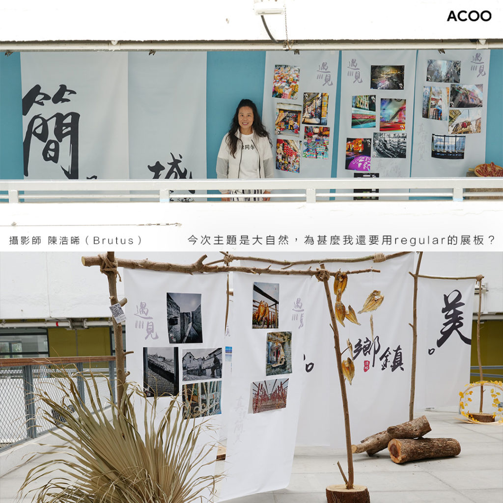 「我訂了道具回來用電影的方法做舊,但我覺得自己好假。」Brutus從前是攝影大師及導演何藩的徒弟,對影像、色彩及故事的呈現有一套自己的堅持,因為想把相中最真實的局部呈現觀眾眼前,盡所能的呈現主題「真.樸.簡.美」,甚至找來園藝朋友帶她砍樹,她笑言:「聽到後是否想合法嗎?這是『銀合歡』,因為繁殖能力高,政府甚至歡迎大家去斬。」相片的展架,就是用銀合歡的樹枝及樹幹組合而成,由Brutus親自綑綁、測試安全。