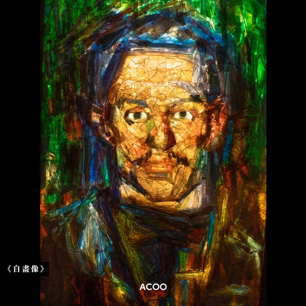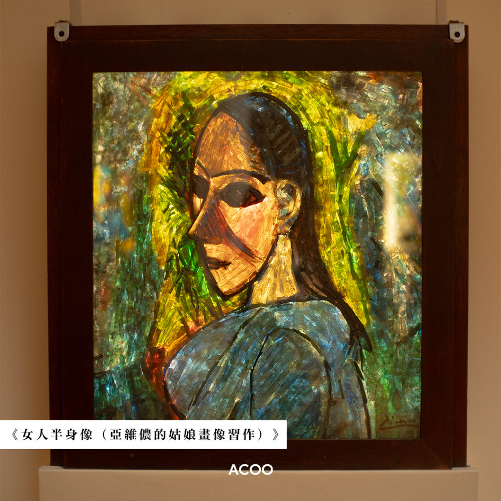 這是全埸唯一一張男性肖像畫,並繪於畢加索年輕時,其「藍色時期」(Blue Period)的原作色調為是藍色和綠色,有着沉靜或憂鬱的感覺,而玻璃畫則色彩繽紛,兩者散發着完全不同的感覺。若好奇原作,可掃描畫作介紹上的二維碼。