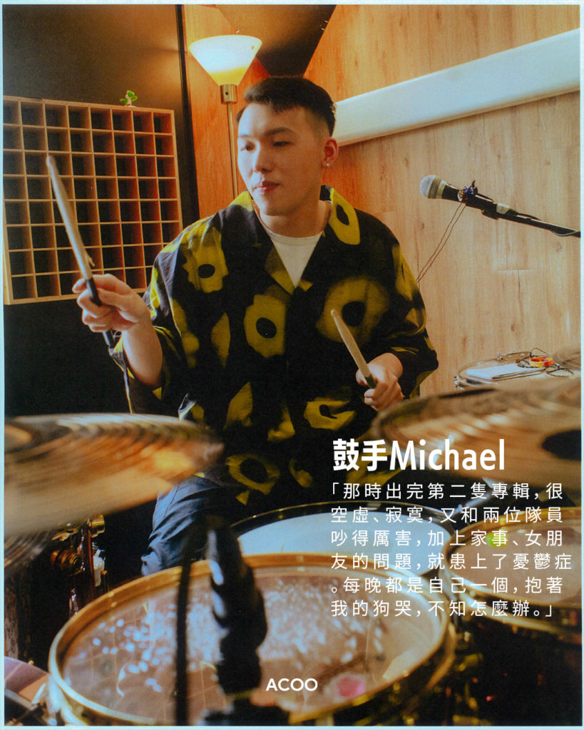 期間,Michael更患上憂鬱症,度過無比煎熬的時期。「那時出完第二隻專輯,很空虛、寂寞,又和兩位隊員吵得厲害,加上家事、女朋友的問題,就患上了憂鬱症。我每晚都是自己一個,抱著我的狗哭,不知怎麼辦。」在團隊低迷的氣氛下,三人唯有先停下來各自沉澱,暫停合作長達一年。