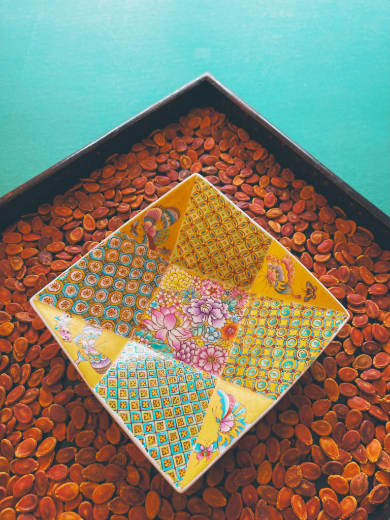 臨近農曆新年,藝術家們的一些作品也非常應節,其中廖綺玲 Betty 的「八寶盒」寓意 8 件吉祥珍寶,各件手繪上細緻花紋,希望帶來祝福,「祝願大家幸福、吉祥、富裕、事事如願。」另一件「賀瓷」則猶如百家布,拼湊願望與祝福,傳統港彩紋飾為主,展現出,熱鬧喜慶,年味濃郁的感覺。