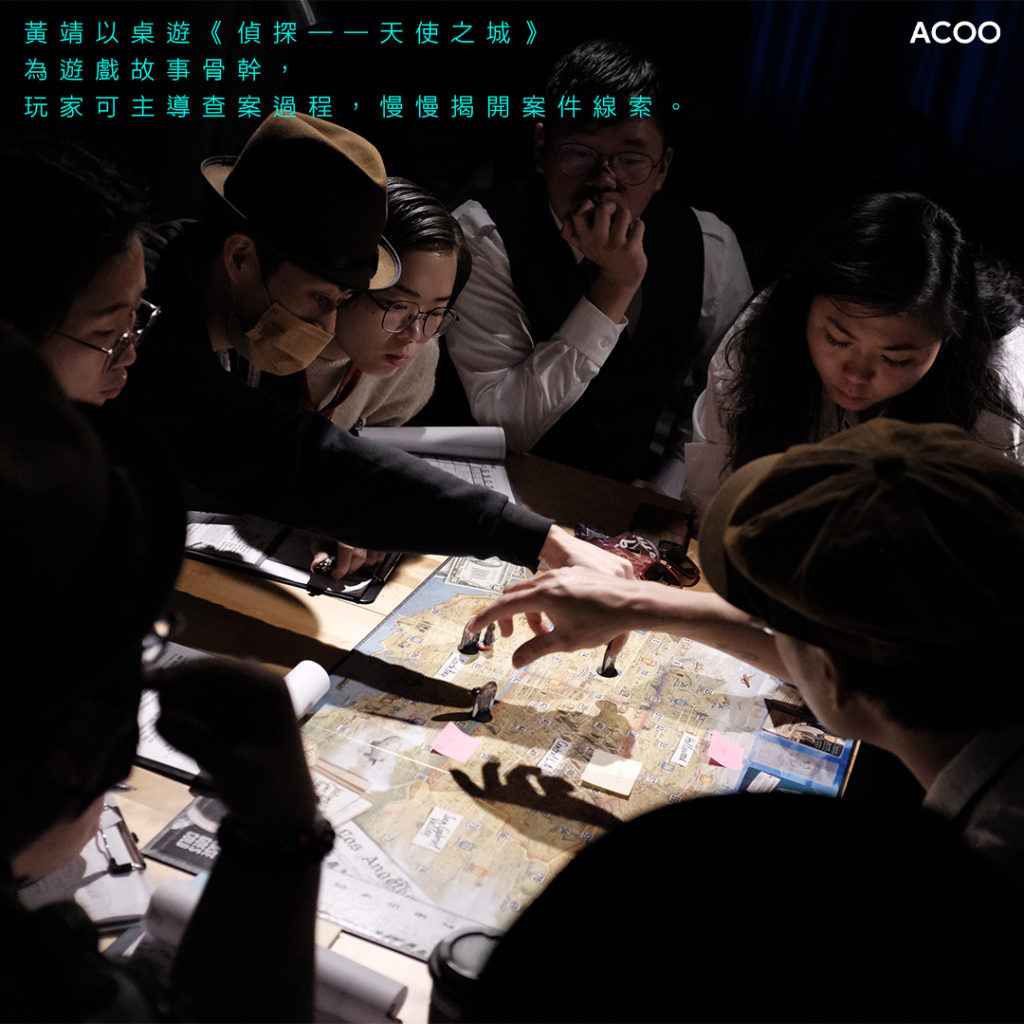 目前,黃靖已舉辦兩場實驗工作坊。他以桌遊《偵探——天使之城》為遊戲故事骨幹,玩法類似劇本殺,玩家分為兩批,「探員(玩家)」負責以第一身角度參與遊戲,投入「探員」這個角色並和其他參加者互動、「內務官(花生友)」則負責旁觀「探員」查案,慢慢揭開案件線索,相對參與度較「探員」低。「我自己覺得,中國人玩的劇本殺,很容易去到『純推理』,很多本為了讓推理部分難一點,有一些『橋』是為了難估而作,而非角色合理而創作,導致玩家有時候為了放心力推理,變成『dry推』,忽略角色扮演、沉浸。」,黃靖道。