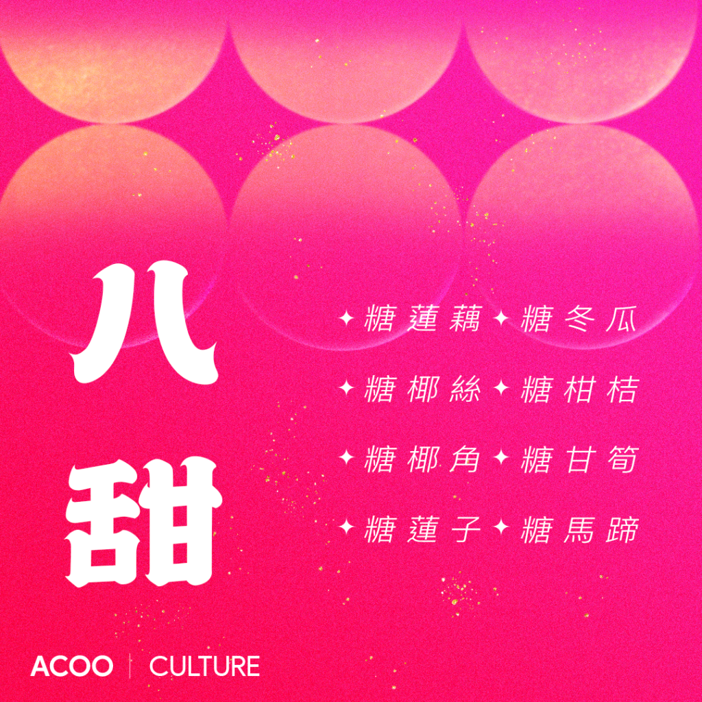 全盒主要放八種甜食和油器,稱為「八甜」,包括糖蓮藕,糖椰絲,糖椰角,糖蓮子,糖冬瓜,糖柑桔,糖甘筍和糖馬蹄,寓意美好和甜甜蜜蜜,連生貴子,三代同堂和馬到功成等等的意思。除了「八甜」之外,油器外表是金黃色,是金錢的顏色,例如炸油角,就是希望來年錢包滿滿的好兆頭,笑口棗即是笑口常開,而煎堆仔就有「煎堆轆轆,金銀滿屋」意思。最後,抓在全盒中間的瓜子動作,就像搲銀子一樣,希望來年人人都會賺更多的錢。