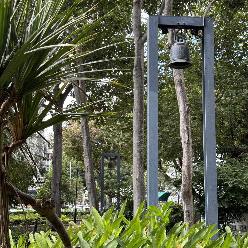 結合廟宇在西貢的傳統作用,以及廣場聚集市民的概念,馮教授將廟前的停車場,改建成前園;另外興建了5個銅鐘從天后廟成一直線至海邊,串連成視覺走廊(Visual Corridor)外,也寓意用鐘聲引領天后到海邊。這5個銅鐘雖然是仿古鐘,但馮教授相信,只要做得認真,便永遠有效:「代表祈求風調雨順,國泰民安。」