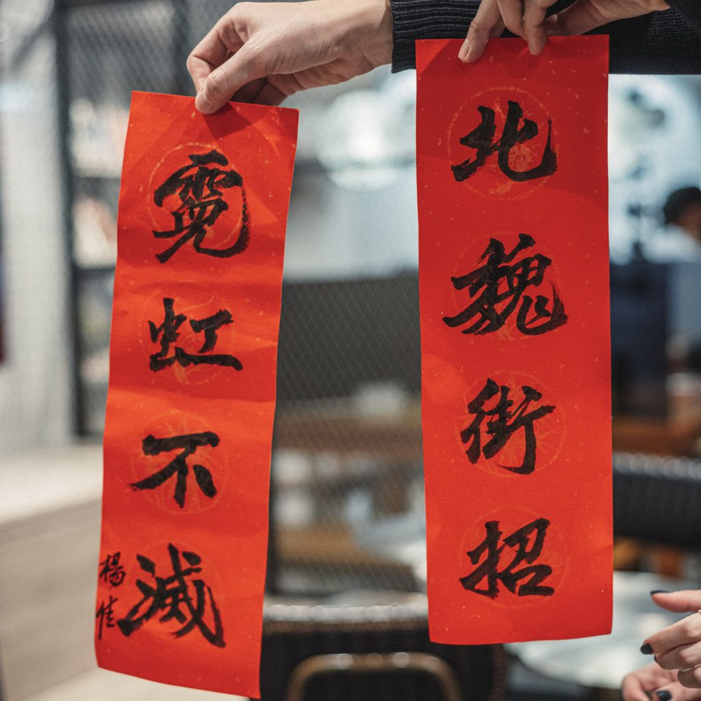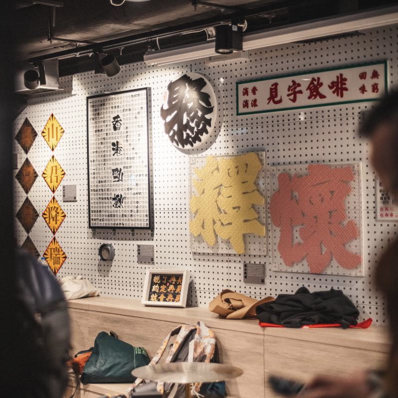 其中專門為貨車寫上北魏體的書法老師傅楊佳亦粉墨登場,更在展覽開放第一天即席揮毫,寫上對聯「北魏街招,霓虹不滅」,希望本土書法文化不滅。除了老前輩外,亦有年輕新世代的代表:修復重塑「爆北魏體」的陳敬倫、「勁揪體」創作人Kit Man(文啟傑)、「硬黑體」設計師阮慶昌。Cafe內有不同展品,外牆的玻璃窗也別出心裁,展示了分別由貨車北魏體、爆北魏體及李漢港楷寫成的贏字。要贏,你又懂得贏字如何寫嗎?把握機會到展覽好好學習吧!