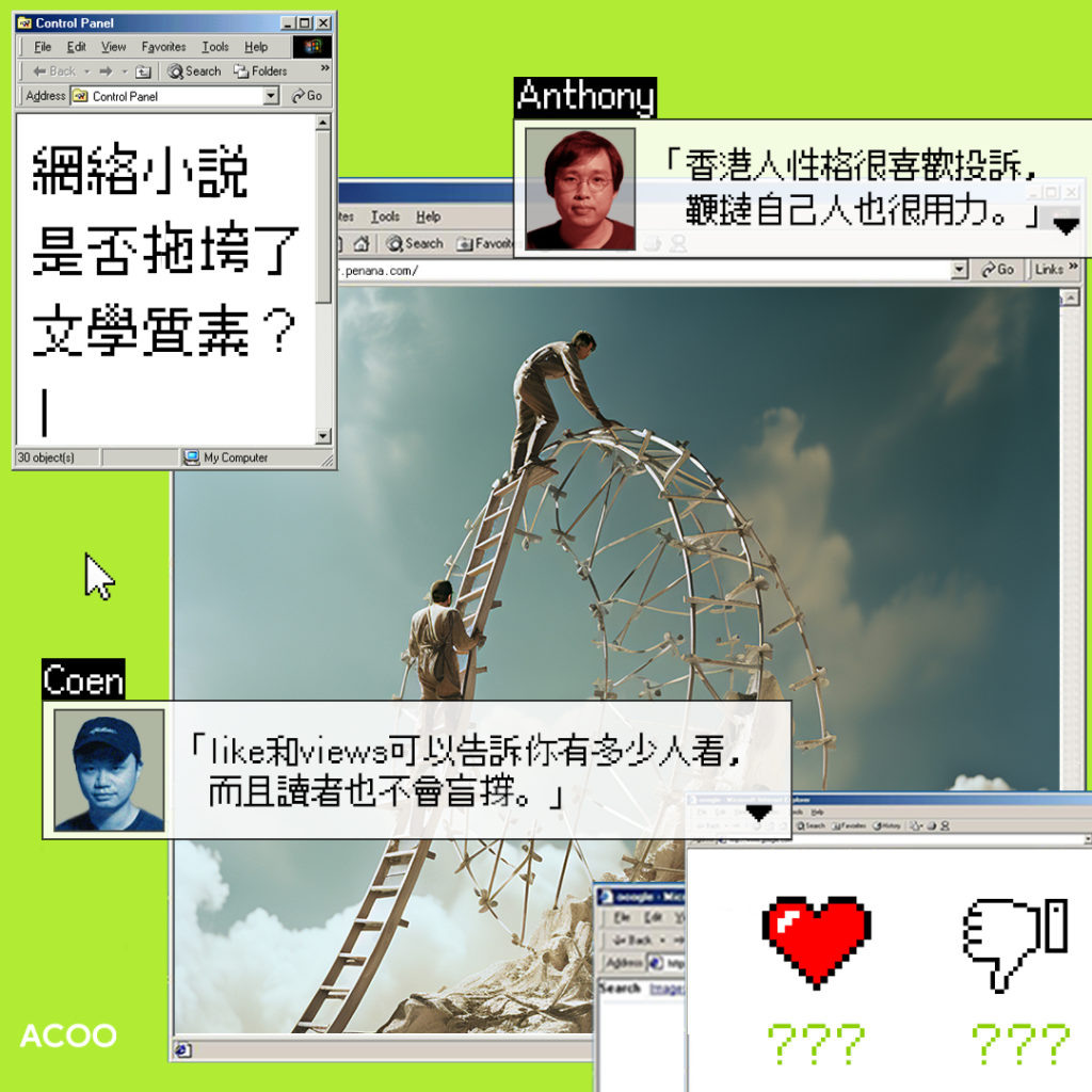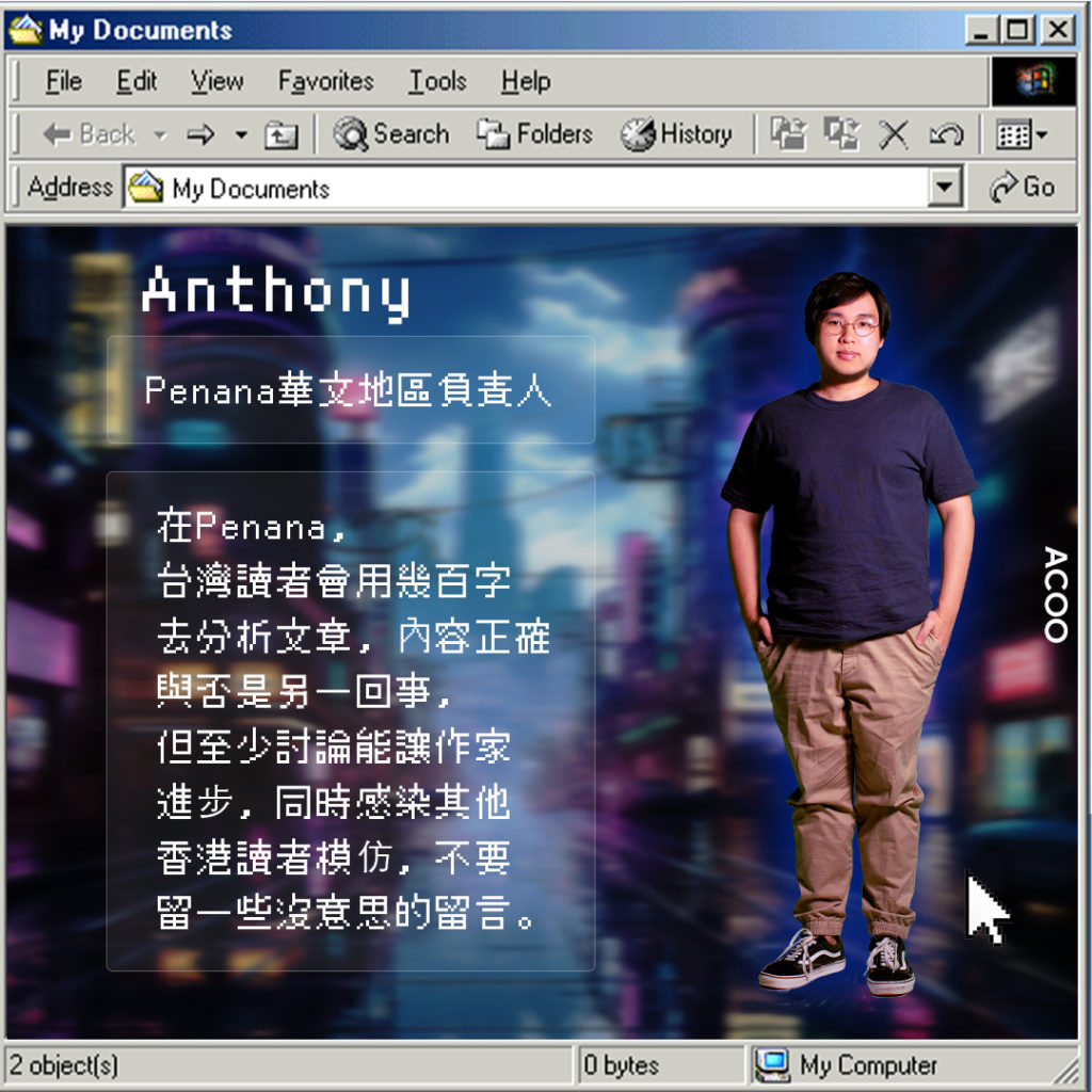 而Anthony則是中文系出身,曾於全港某大型出版社工作,把行業的好與壞一盡收在眼底,「很多位置是封閉了,以至和電影一樣,造成了一些斷層。」畢業後,他突然萌生寫小說的念頭,惟看盡本地出版界的炎涼,令他從最初時已不曾想過加入傳統出版社,轉投網絡平台的懷抱,台灣的平台、香港的討論區也是其目標,即使他心中埋藏着「中文系」的堅持:「看到人工,甚麼堅持也會放在一旁。」因緣際會,他找到了Penana這個平台,發現其技術和介面能築起一個不錯的閱讀生態,既融入了讀者與作家的雙向互動,卻不會像討論區模式般干擾閱讀,且留言算是有營養,「台灣讀者會用幾百字去分析文章,內容正確與否是另一回事,但至少討論能讓作家進步,同時感染其他香港讀者模仿,不要留一些沒意思的留言。」