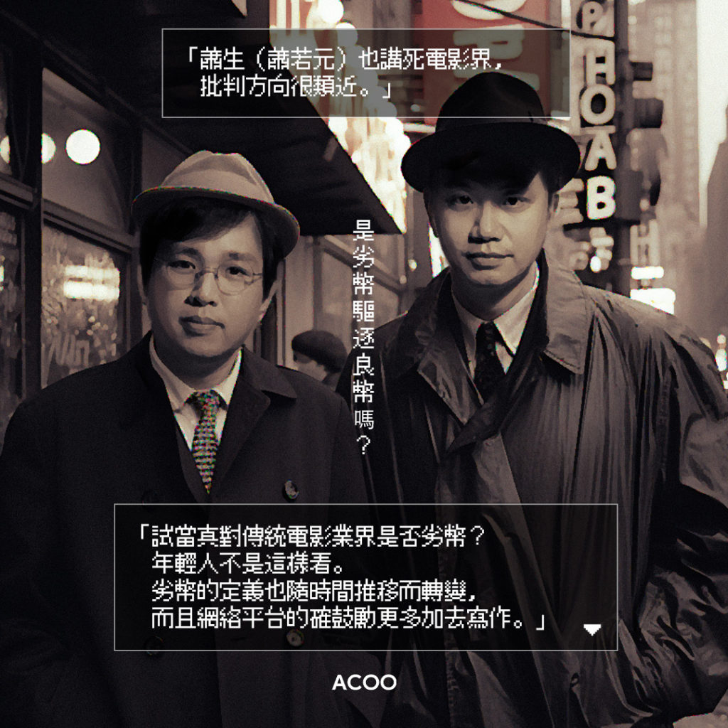 「蕭生(蕭若元)也講死電影界,其實這個批判方向很類近。」Anthony認為作品數量越多,質素自然越參差,或許有人認為是劣幣驅逐良幣,但需思考甚麼是劣幣?「試當真對傳統電影業界是否劣幣?年輕人不是這樣看,其實劣幣的定義也隨時間推移而轉變,而且網絡平台的確鼓勵更多加去寫作。」
