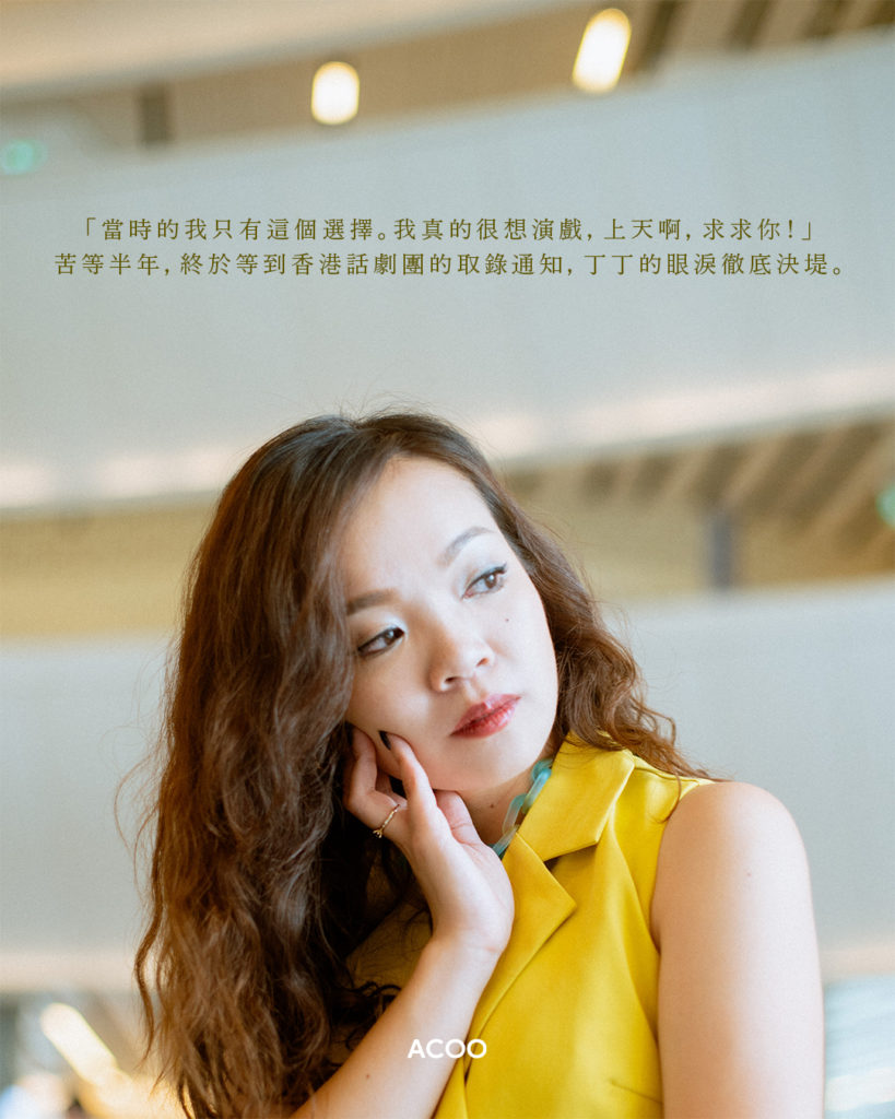 於是又半年之後,丁丁終於等到了那個夢寐以求的電話。那是第三次面試翌日,而丁丁早知面試結果會於當日出爐。那晚,她竭盡全力才睡了兩小時。「當時的我只有這個選擇。我真的很想演戲,上天啊,求求你!」早上八點醒來,她坐在床上等了又等,總算接到了劇團的電話。