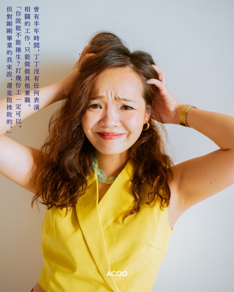 「試過最長有半年時間,我是完全跟戲劇或表演接不上軌的。」她沒有接到任何表演相關工作,為了維持生計,她做過餐飲業、樓盤導賞員。「你說能不能維生?打幾份工一定可以。但對剛剛畢業的我來說,還是挺挫敗的。」滿懷抱負,卻是一畢業即失業,丁丁難免開始質疑自己,「我是不是不適合這行?」但她又不甘就此離開,就此放棄夢想,於是就這樣堅持了一年半的自由業生涯。