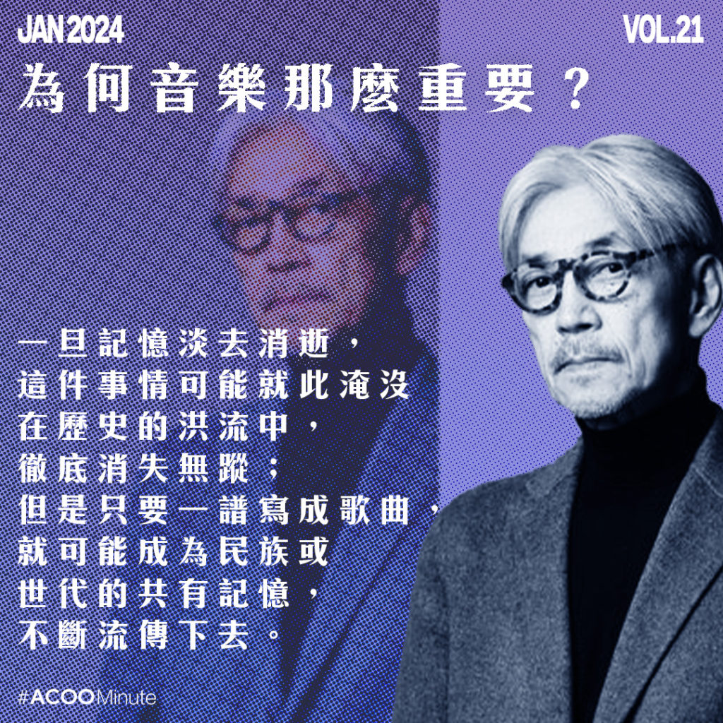 近年經常在音樂節看到的「音樂使人自由」T恤,口號其實出自坂本龍一的第一本自傳《音樂使人自由》。坂本的自由,體現在他的人生選擇上。他早年組樂團Yellow Magic Orchestra,創新前衛的風格,令他們在80年代紅到國外,他卻對被關注感到厭惡,轉為專注個人音樂。後來成為電影配樂大師,也非刻意舖排。名曲《Merry Christmas, Mr. Lawrence》來自電影《戰場上的快樂聖誕》,坂本龍一本來只被邀做演員,但他大膽地要求導演讓他製作配樂,結果開啟了他的電影配樂之路。