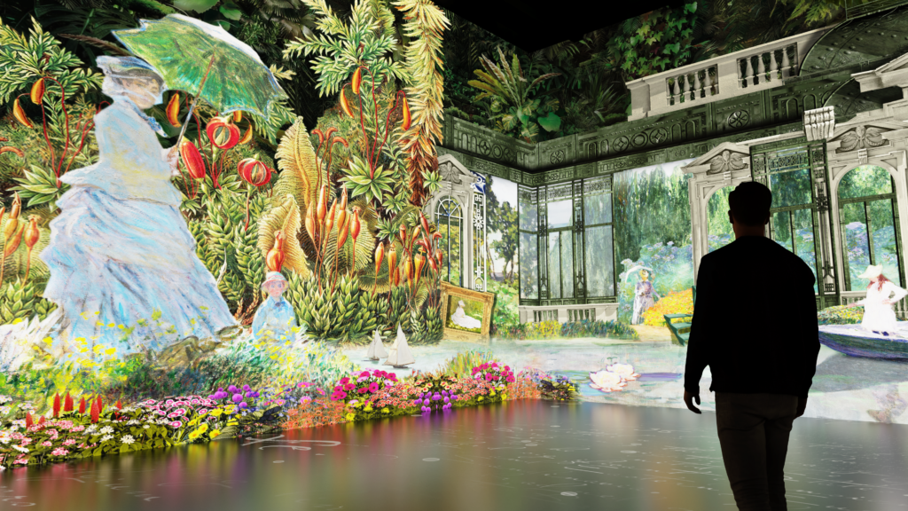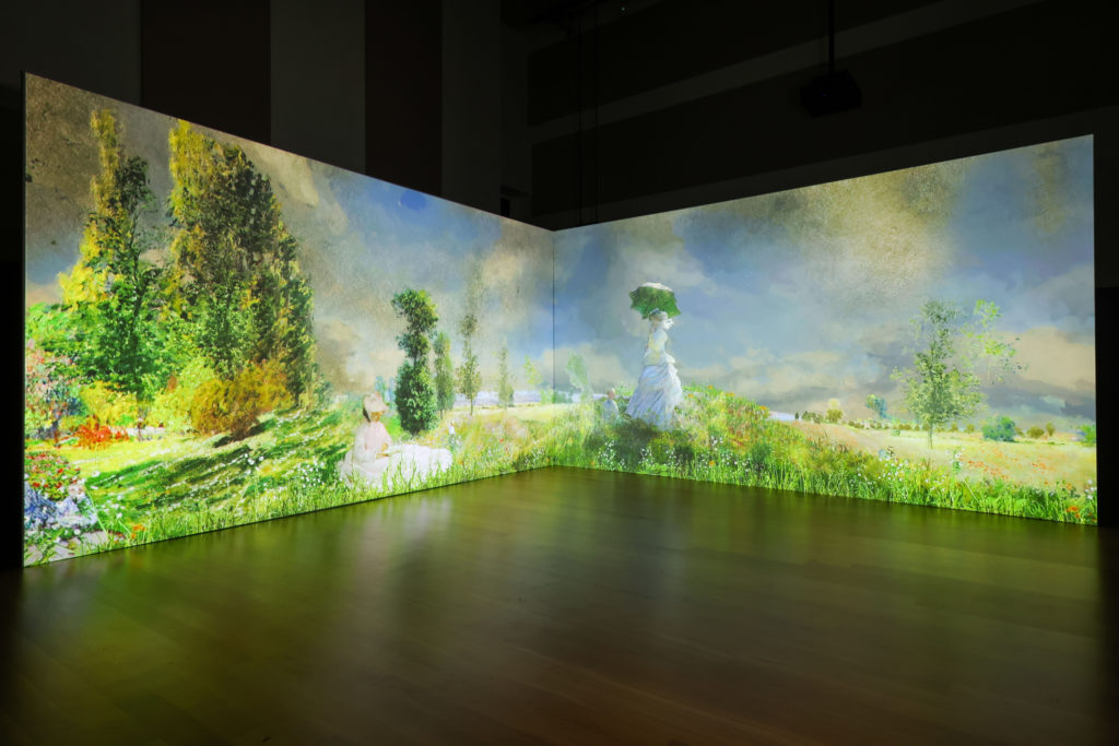 不同於一般美術館名畫展覽,沉浸式體驗展是近年藝術的新突破 —— 音樂配合光影效果,再適當的把細節元素動畫化,作品就像重新活過來一般,徹底打破傳統畫框的界限。比利時創意工作室Dirty Monitor團隊的15位數碼藝術家,用了65,000多張底片,重新呈現莫內近200幅名畫,加上特別為展覽而創作的配樂,觀眾就如置身畫中,看着《打陽傘的女人-莫內夫人和她的兒子》時,彷彿感覺微風吹向臉龐。