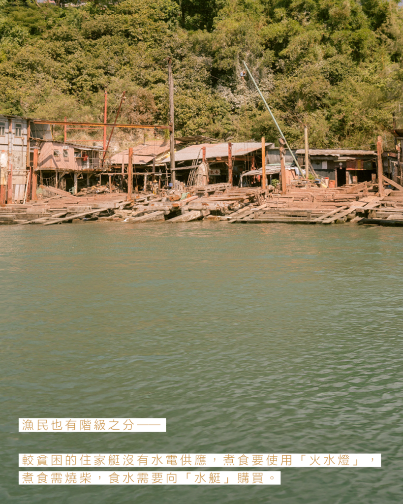 很多漁民都住在艇上,稱為「住家艇」,船隻會固定停泊在避風塘,像是一間海上屋,漁民會組成一個社區組織。有趣的是,漁民也有階級之分,較貧困的住家艇沒有水電供應,煮食要使用「火水燈」,煮食需燒柴,食水則需要向「水艇」購買;而較富裕的住家艇則使用發電機發電,或向電燈公司申請電箱從岸上拉電,亦會使用罐裝石油氣來煮食。