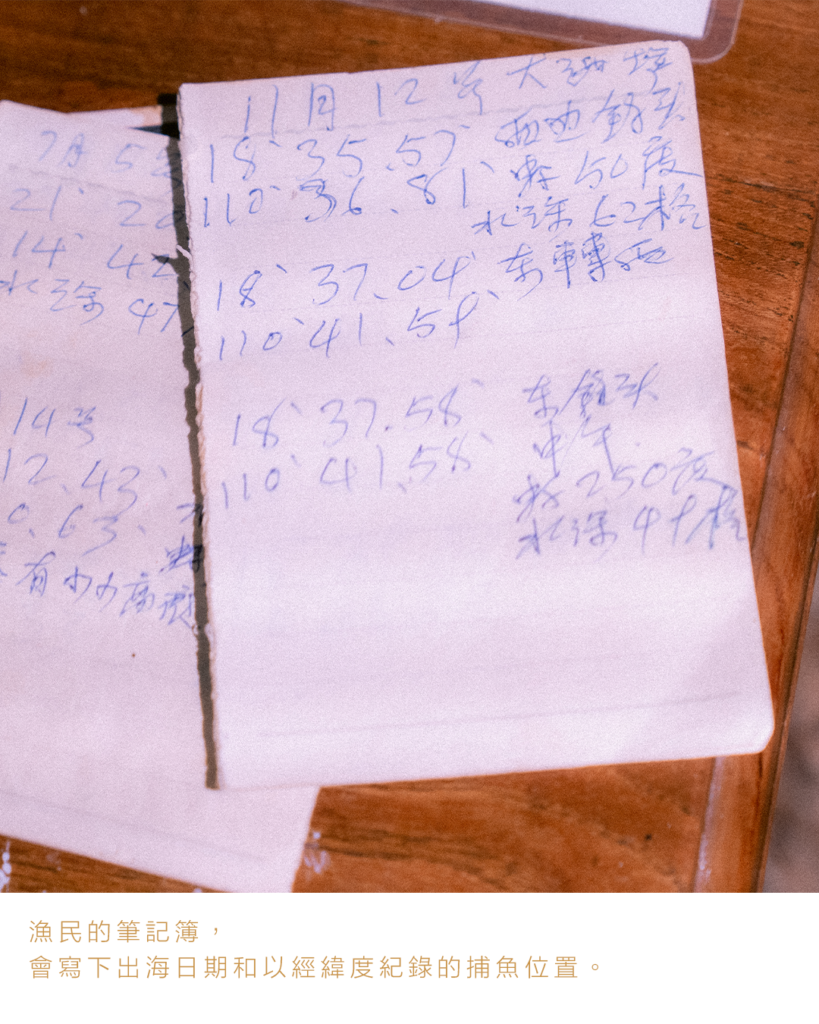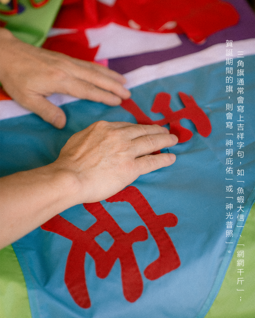 「船上的三角旗(又稱大單旗)通常寫上吉祥字句,像『魚蝦大信』、『網網千斤』或『風調雨順』等,如果是賀誕期間的旗,則會寫『神明庇佑』或『神光普照』等。」鴻運繡莊的黃國興師傅今年62歲,從少年時期17歲跟父親入行工作,不經不覺已做了40多年的旗,他說:「漁民出海捕魚,每次出海的時間以月計,大海風雲萬變非常危險,掛旗除了希望漁獲大勝,也是祈求神明保佑平安。」